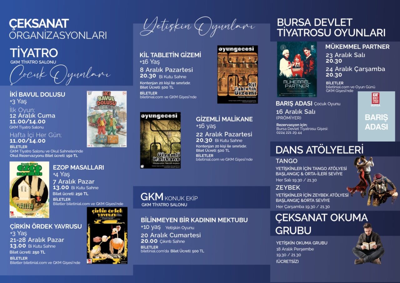 Ayrıca Bursa Devlet Tiyatrosunun çocuk oyunu “Barış Adası” 16 Aralık Salı günü ÇEKSanat GKM’de prömiyer yapacak.