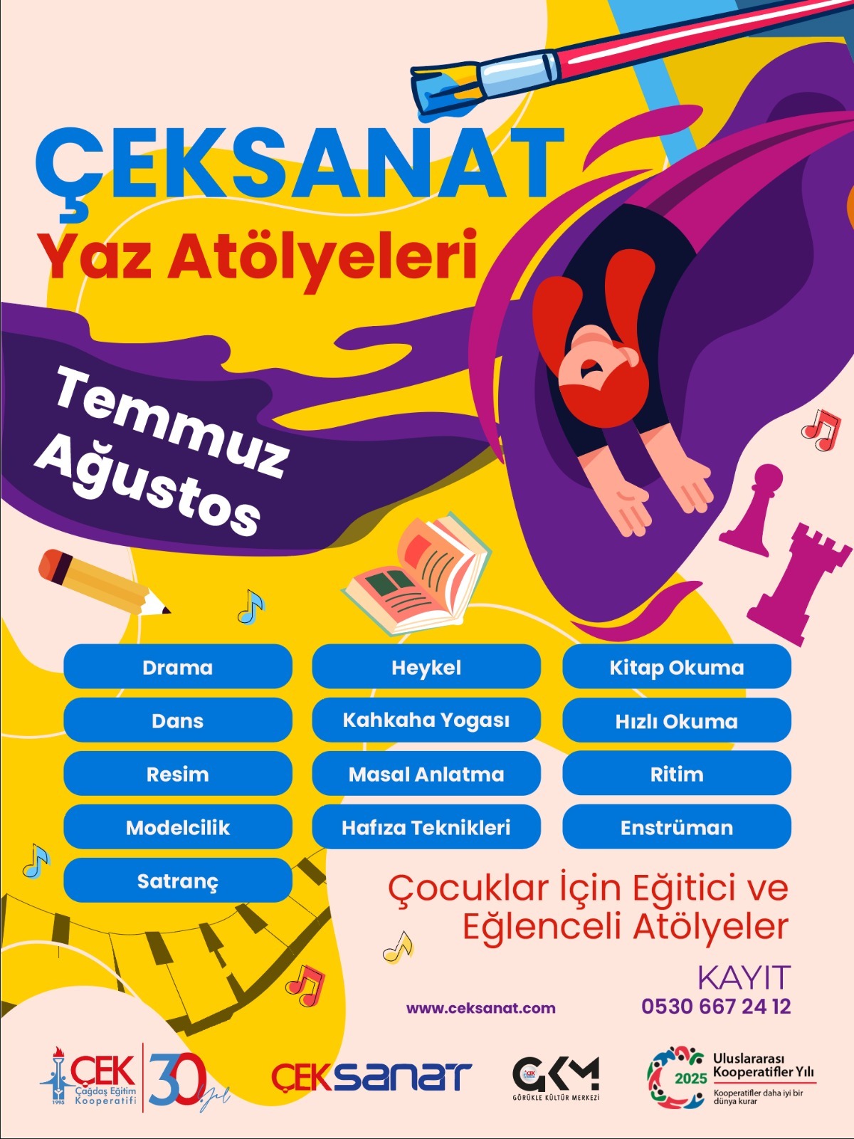 Drama, dans, resim, heykel, müzik, kahkaha yogası, masal anlatımı, modelcilik, satranç, kitap okuma, hızlı okuma ve hafıza teknikleri gibi birbirinden renkli atölyelerde çocuklar hem eğlenecek hem de öğrenmenin keyfini yaşayacak.