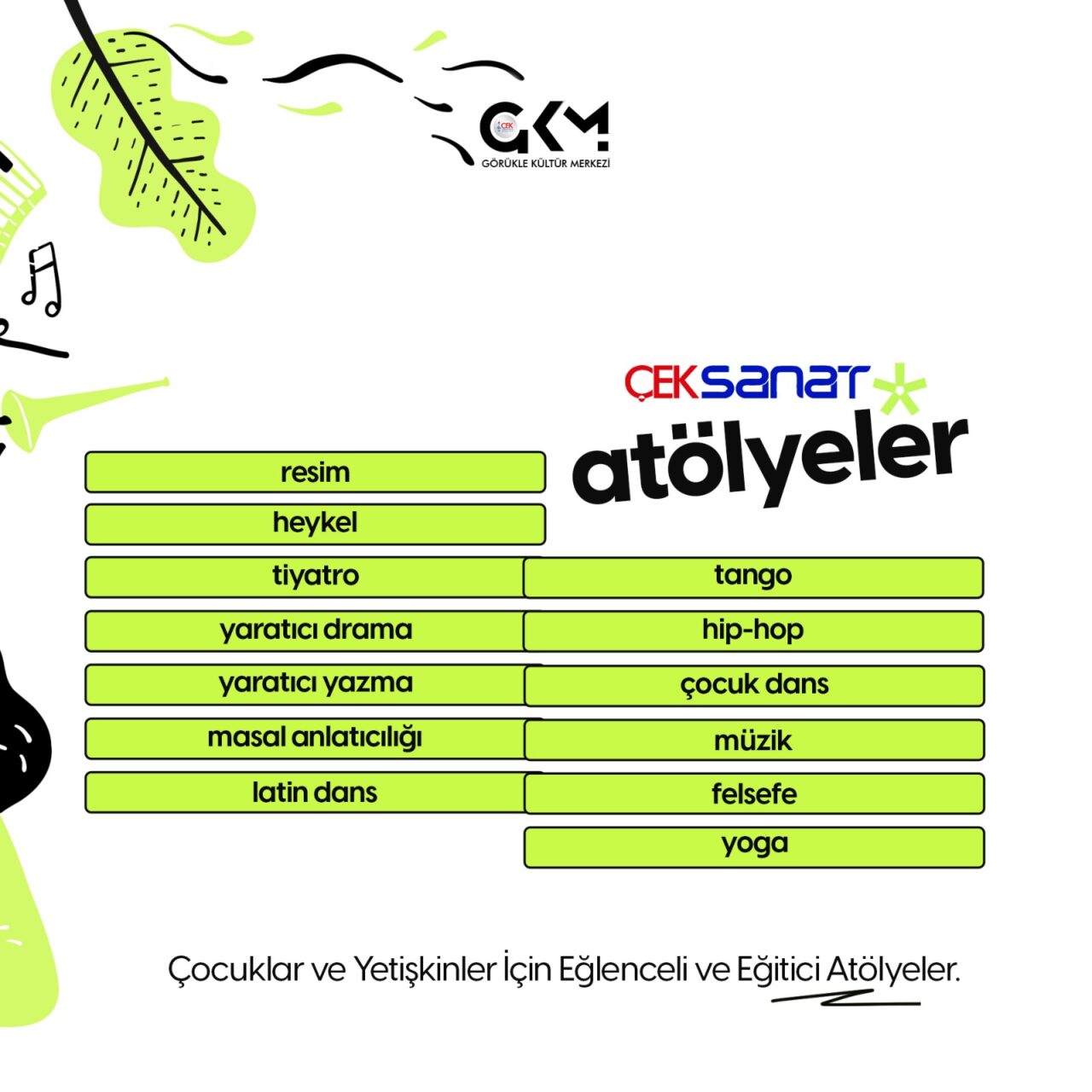 Atölye sayısını arttıran ve her yaşa hitap eden bir program hazırlayan ÇEKSANAT; çocuklar için müzik, resim, tiyatro, düşünme, drama, heykel, yaratıcı yazma, Hip-Hop ve çocuk dans atölyeleri açarken gençler için de tiyatro atölyesini hizmete sokuyor. Bu sezon yetişkin grupları için de tango, tiyatro, drama, resim, heykel, yoga, felsefe, latin dans, masal anlatıcılığı ve yaratıcı yazma atölyeleri çalışmalarına devam edecek. ÇEKSANAT resim ve heykel atölyeleri için gündüz grupları da oluşturuyor.