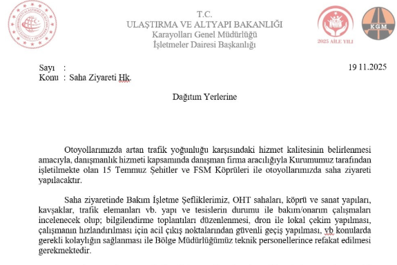 “Otoyollarımızda artan trafik yoğunluğu karşısında hizmet kalitesinin belirlenmesi amacıyla, danışman firma aracılığıyla Kurumumuz tarafından işletilmekte olan 15 Temmuz Şehitler ve FSM köprüleriyle otoyollarımızda saha ziyareti yapılacaktır.”