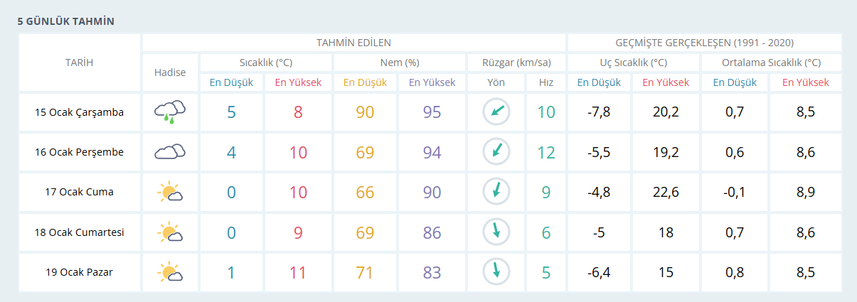16 Ocak Perşembe: çok bulutlu, en düşük 4, en yüksek 10 derece