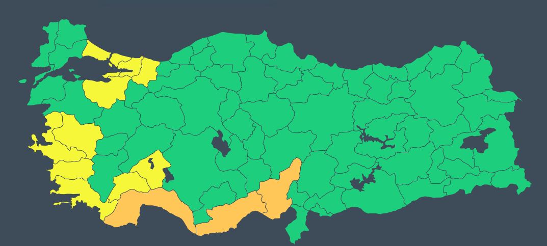 Aydın, Burdur, Bursa, Isparta, İstanbul, İzmir, Kocaeli, Manisa, Muğla, Sakarya ve Yalova için sarı kodlu,