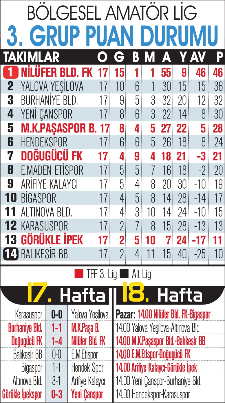 Pablo Martin Batalla yönetimindeki Nilüfer Belediye FK, oynadığı 17 maçta 46 puana ulaşarak 3.Lig yolunda bir engeli daha aşmış oldu. Bursa ekibinin takipçisi Yalova Yeşilovaspor ise Sakarya’da Karasuspor ile 0-0 berabere kalınca puan farkı 10’a çıkmış oldu.
