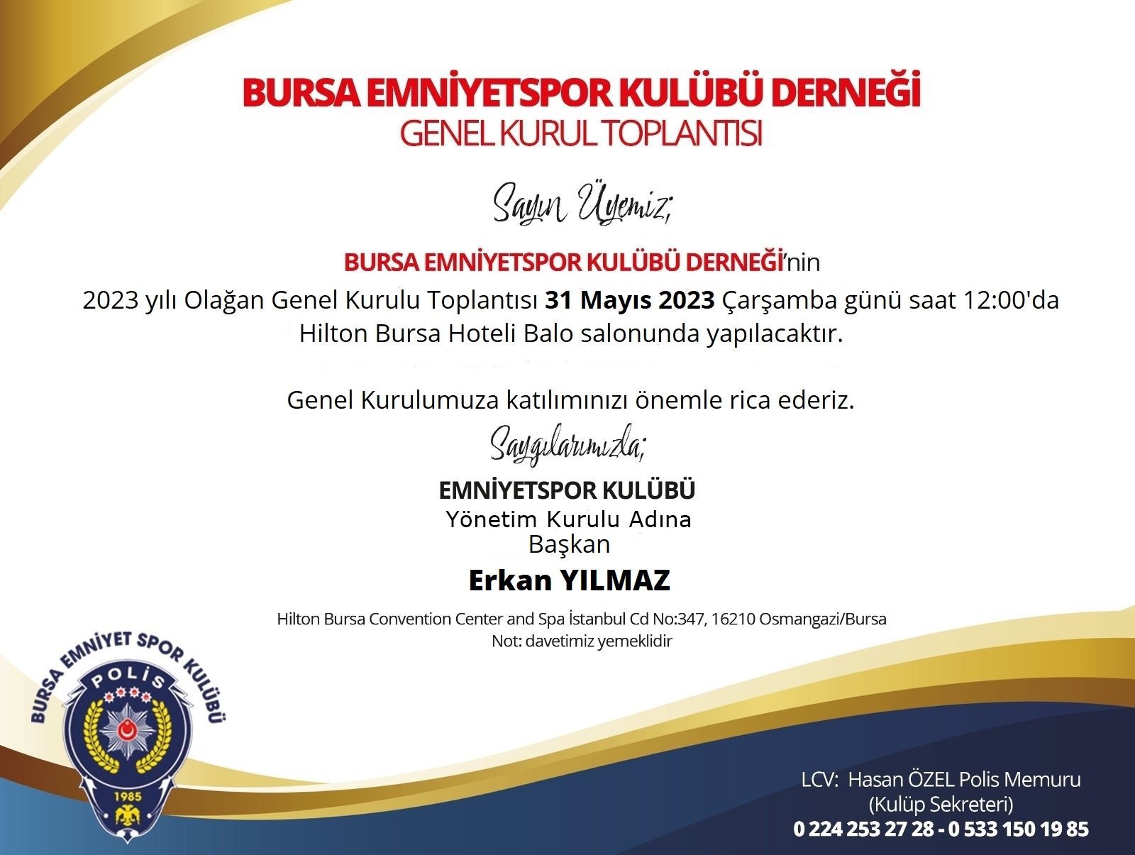 Bursa Emniyetspor Kulübü’nün Olağan Genel Kurulu 31 Mayıs Çarşamba günü gerçekleştirilecek…