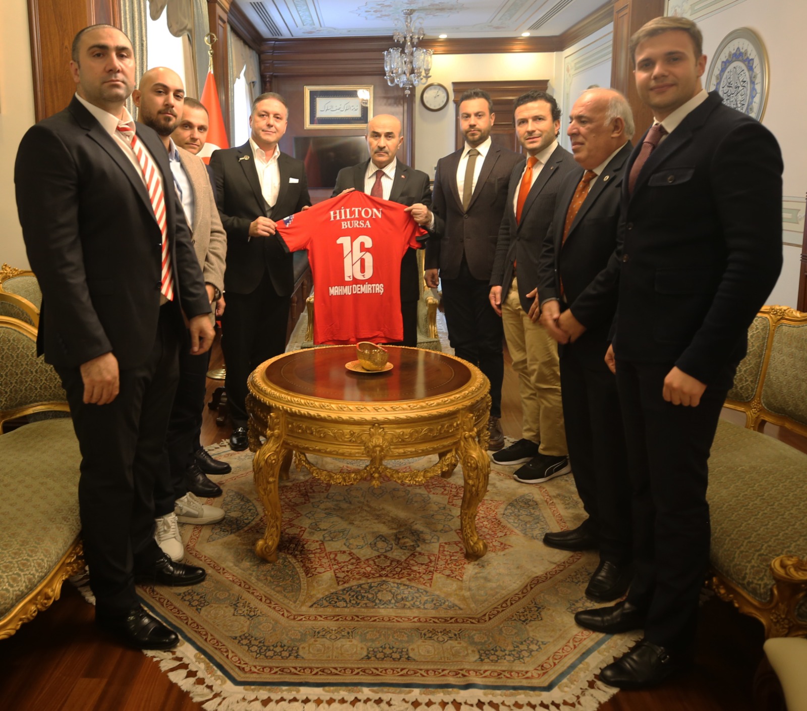 Başkan Yılmaz, Vali Demirtaş’a kulüp formasını ve Bursa Ulucami manzaralı tablo hediye etti.