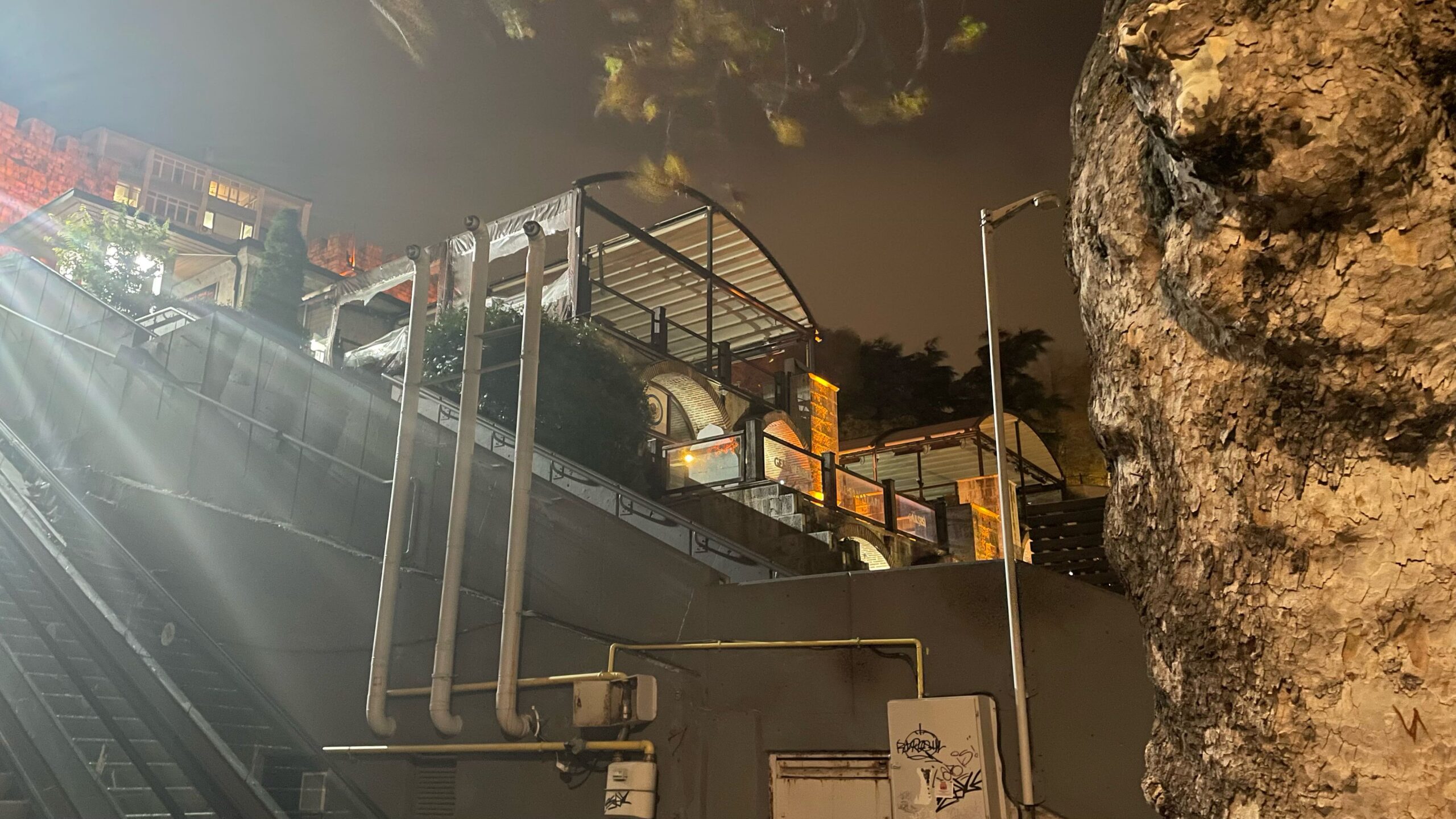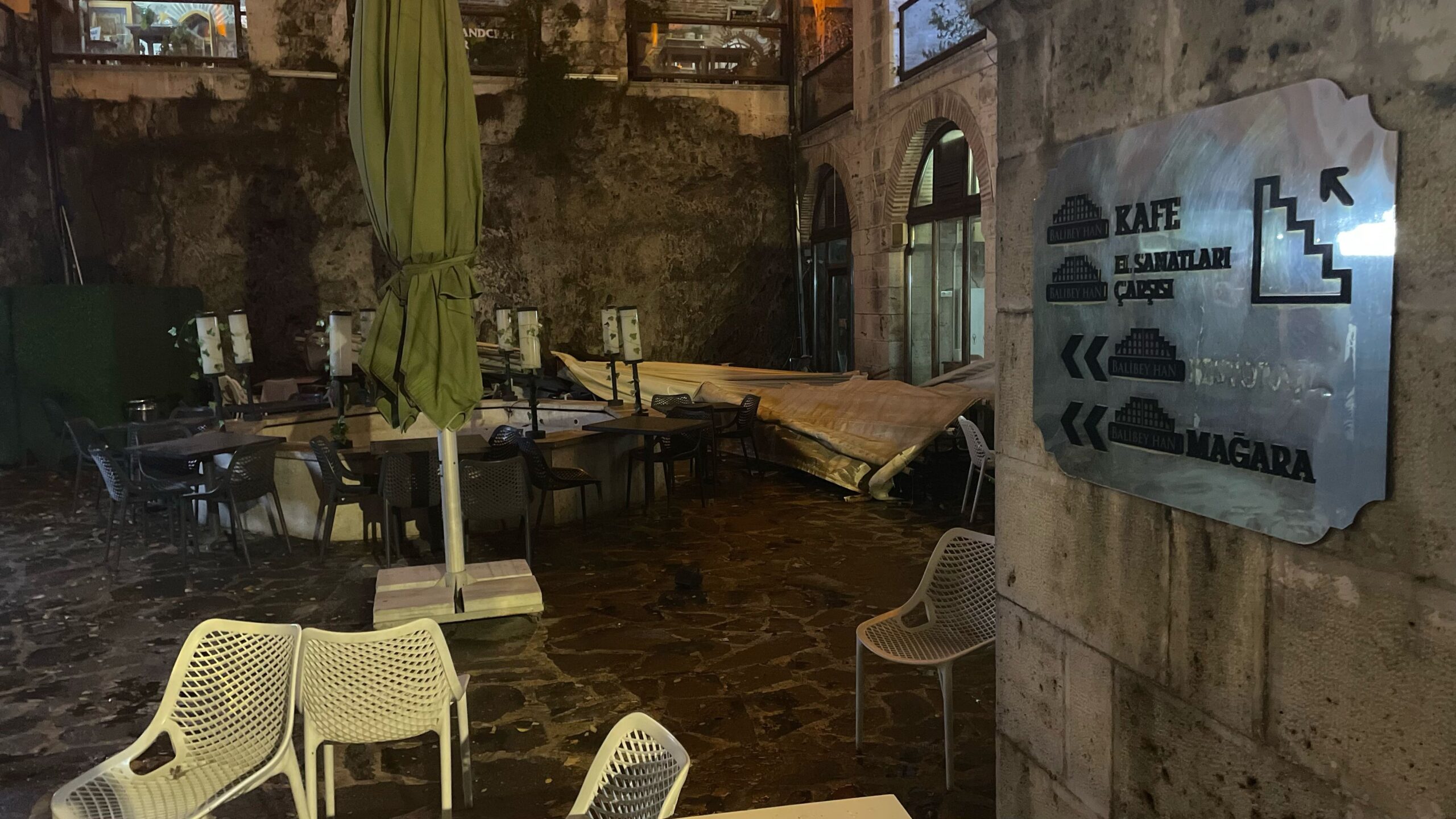 Bursa’da restorasyonla yeniden ayağa kaldırılan Balibey Han’ın üstündeki kafenin verandası da hanın içine düştü.
