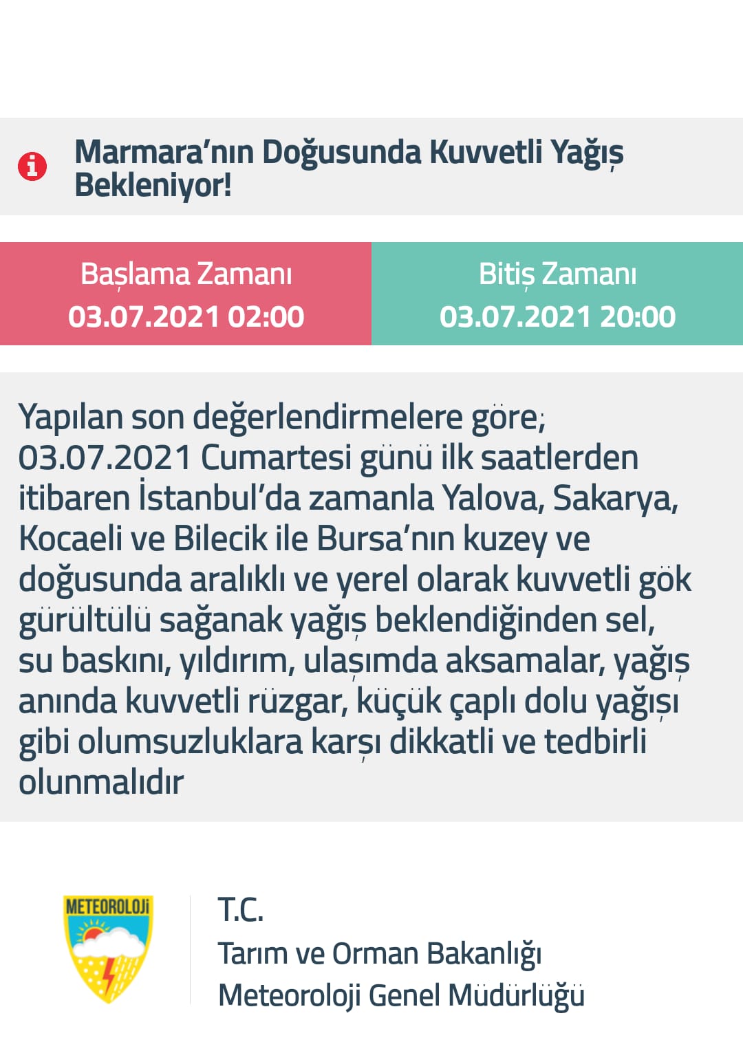 Açıklamada, “Yapılan son değerlendirmelere göre; cumartesi günü ilk saatlerden itibaren İstanbul’da zamanla Yalova, Sakarya, Kocaeli ve Bilecik ile Bursa’nın kuzey ve doğusunda aralıklı ve yerel olarak kuvvetli gök gürültülü sağanak yağış beklendiğinden sel, su baskını, yıldırım, ulaşımda aksamalar, yağış anında kuvvetli rüzgar, küçük çaplı dolu yağışı gibi olumsuzluklara karşı dikkatli ve tedbirli olunmalıdır” denildi.