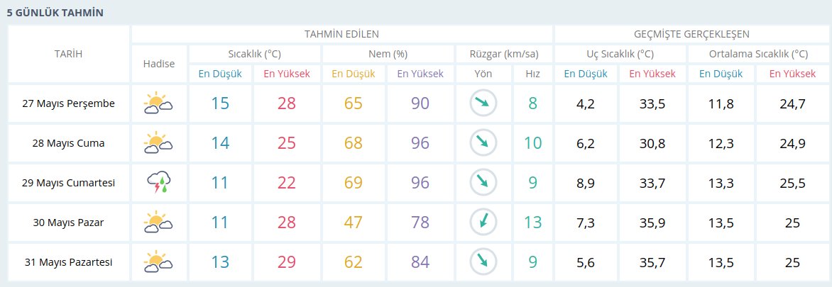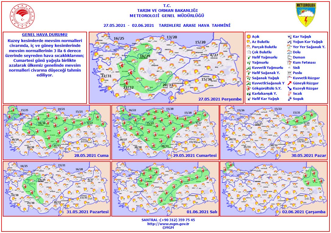 Haftalık Hava Durumu (27 May – 2 Haz 2021) Kuzey kesimlerde mevsim normalleri civarında, iç ve güney kesimlerde mevsim normallerinin 3 ila 6 derece üzerinde seyreden hava sıcaklıklarının; Cumartesi günü yağışla birlikte azalarak mevsim normalleri civarına düşeceği tahmin ediliyor.