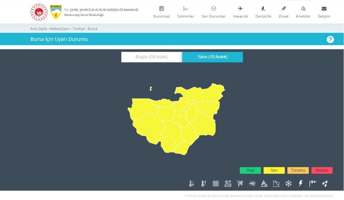 “Rüzgârın güney yönlerden fırtına (50-70 kilometre/saat), yüksek kesimlerde hamleli kuvvetli fırtına (70-90 kilometre/saat), yer yer tam fırtına (90-100 kilometre/saat) şeklinde eseceği tahmin ediliyor. Çatı uçması, ağaç ve direk devrilmesi, toz savrulması, ulaşımda aksamalar ile soba ve baca gazı zehirlenmeleri gibi olumsuzluklara karşı dikkatli ve tedbirli olunmalıdır. Cumartesi sabah saatlerinde etkisini azaltacak fırtınanın aynı gün akşam saatlerinde tekrar kuvvetleneceği tahmin ediliyor”