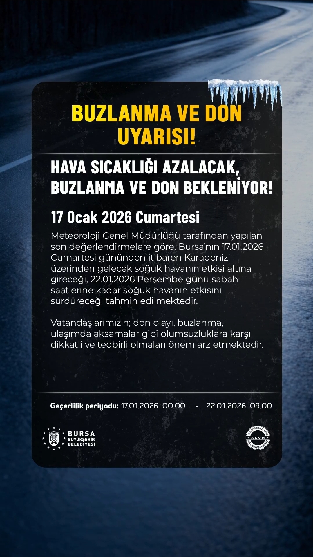 Bursa Valiliği ve Büyükşehir Belediyesi, yarından itibaren Bursa’da soğuk havanın beklendiğini belirterek vatandaşları uyardı.