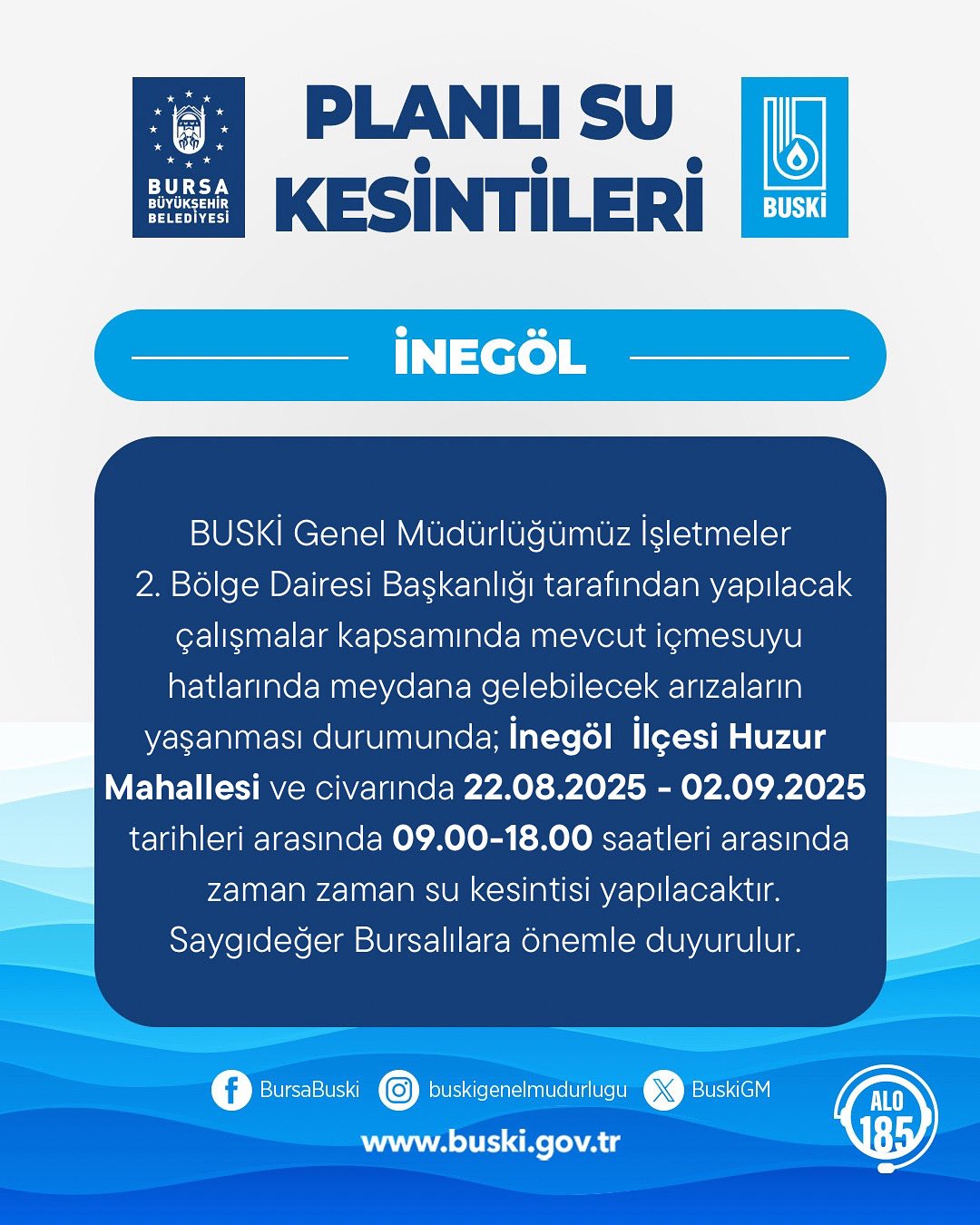 BUSKİ Genel Müdürlüğü; İnegöl ilçesi Huzur Mahallesi civarında 22 Ağustos-2 Eylül tarihleri arasında belirlenen saatlerde su kesintisi yapılacağını bildirdi.