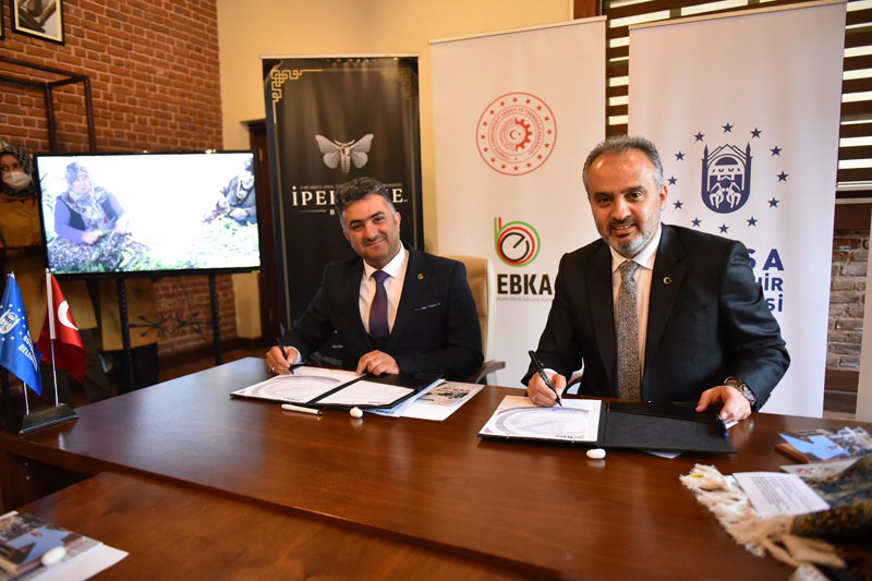 Son yıllarda ‘Bursa İpeği Yeniden Hayat Buluyor’ projesiyle Umurbey İpek Üretim ve Tasarım Merkezi ve kırsal bölgelerde açılan dokuma tezgahlarında ipek halı dokuma faaliyetlerine ağırlık veren Bursa Büyükşehir Belediyesi, Bursa İpeğinde üretimin artırılması amacıyla yeni bir projenin startını veriyor. Bursa Büyükşehir Belediyesi’nin, Bursa, Eskişehir, Bilecik Kalkınma Ajansı (BEBKA) ile birlikte hayata geçireceği ‘İpek Şehri Bursa: Kırsal Kalkınma Projesi’ ile Bursa İpeğinde üretiminin arttırılması, üretimde modernizasyonun ve daha fazla kadına istihdam sağlanması hedefleniyor. Projenin 3 milyon 275 bin TL olan bütçesinin, 2 milyon 300 bin TL’si BEBKA tarafından karşılaşacak ve proje 18 ay sürecek. Bursa İpeğini nostaljik bir ürün olmaktan çıkarıp, endüstriyel ticari ürüne dönüştürmenin hedeflendiği projenin protokolü Bursa Büyükşehir Belediye Başkanı Alinur Aktaş ile BEBKA Genel Sekreteri Muhammed Zeki Durak arasında imzalandı.