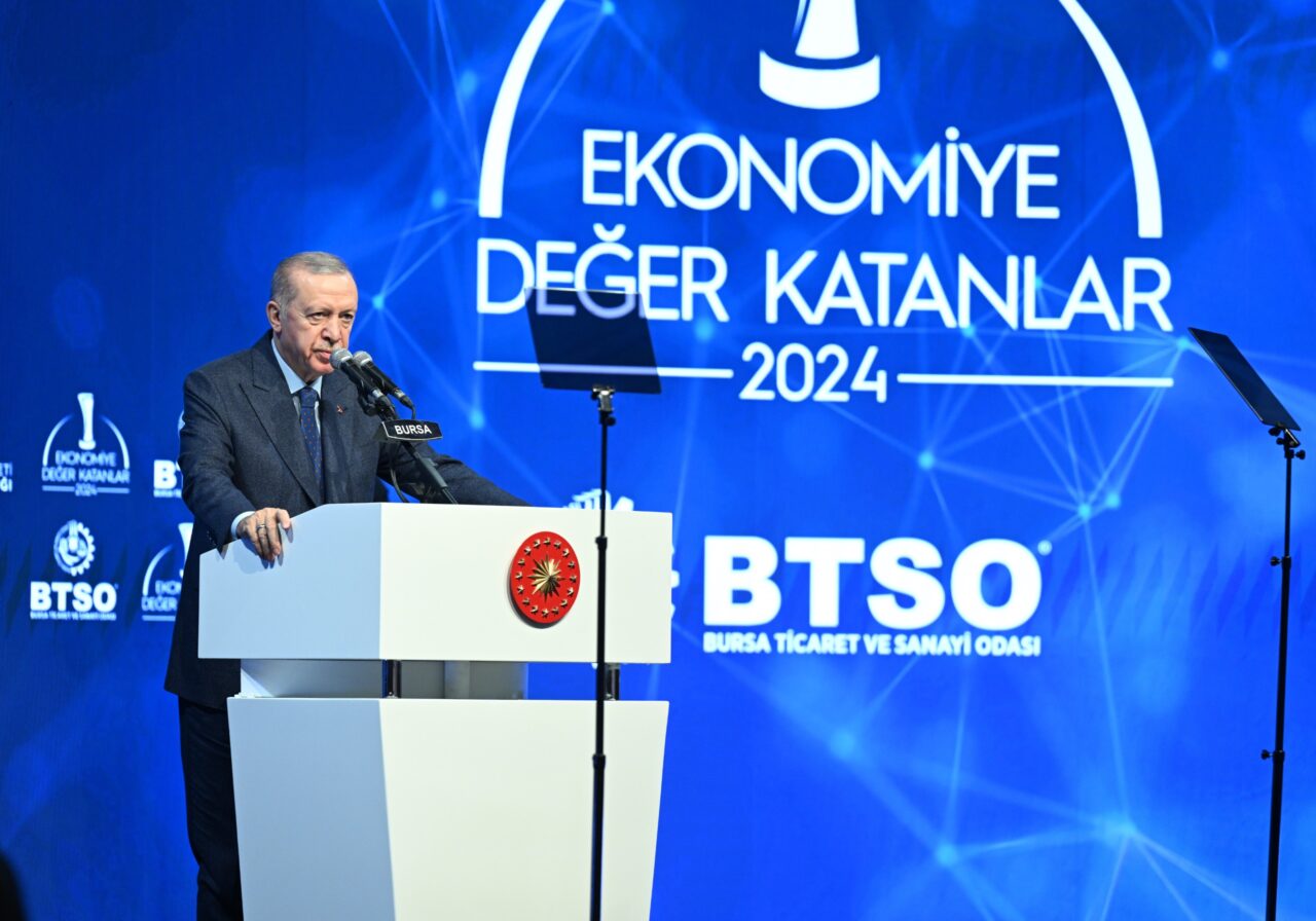 Cumhurbaşkanı Recep Tayyip Erdoğan, sözlerine BTSO’ya marifetin iltifata tabi olduğunu gösterdiği için teşekkür ederek başladı. Erdoğan, “135 yıllık köklü tarihiyle Bursa Ticaret ve Sanayi Odamız, 57 bin üye firmasıyla şehrimizin yanı sıra Türkiye ekonomisine de çok önemli katkılar yapıyor. Bugün ödül törenimizin yanı sıra Odamızın öncülüğünde Sanayi ve Teknoloji Bakanlığımızın destekleriyle hayata geçen Bursa Teknoloji Organize Sanayi Bölgesi – TEKNOSAB’da üretime başlayan 15 firmamızın da açılışını gerçekleştiriyoruz. Bu firmalarımızın sahiplerini ve çalışanlarını da tebrik ediyor, Türkiye’nin kalkınmasına, güçlenmesine ve büyümesine verecekleri destekler için kendilerine şimdiden teşekkürlerimi iletiyorum” ifadelerini kullandı.