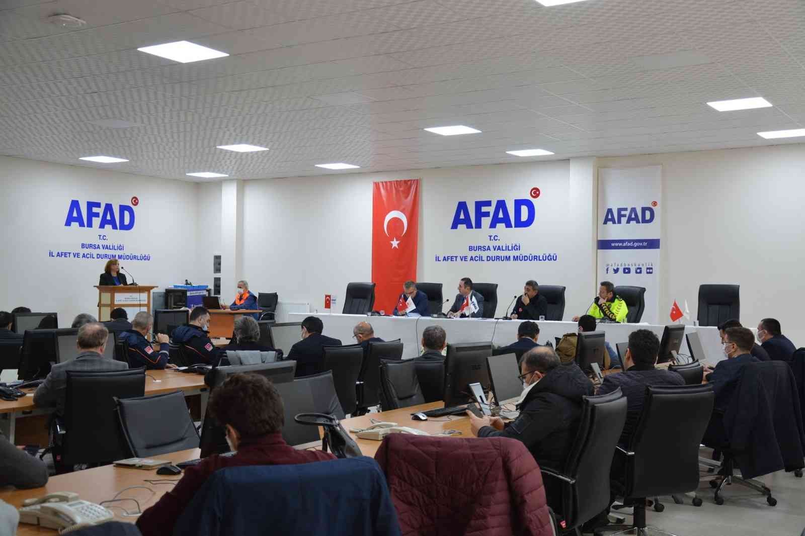 Bursa Vali Yardımcısı Halil Serdar Cevheroğlu başkanlığında Bursa İl Afet ve Acil Durum Müdürü Yalçın Mumcu ve ilgili tüm kurum-kuruluş temsilcilerinin katılımıyla gerçekleştirilen toplantının sonunda gerekli uyarılar kurum ve kuruluşlara gönderildi.