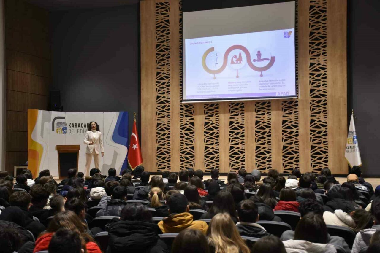 Karacabey Belediyesi Afet İşleri Müdürlüğü, lise öğrencilerine yönelik afet ve acil durum yönetimi konusunda eğitimler veriyor. Ergün Koç Kültür Merkezi’nde 3 gündür süren eğitimler kapsamında öğrencilere deprem, sel ve yangın gibi farklı afet senaryolarında nasıl davranmaları gerektiği konusunda bilgiler verildi. Şu ana kadar Borsa İstanbul Mesleki ve Teknik Anadolu Lisesi, Dayı Karacabey Lisesi, Karacabey Anadolu Lisesi öğrencilerine Afet Farkındalık Eğitimi verildi.