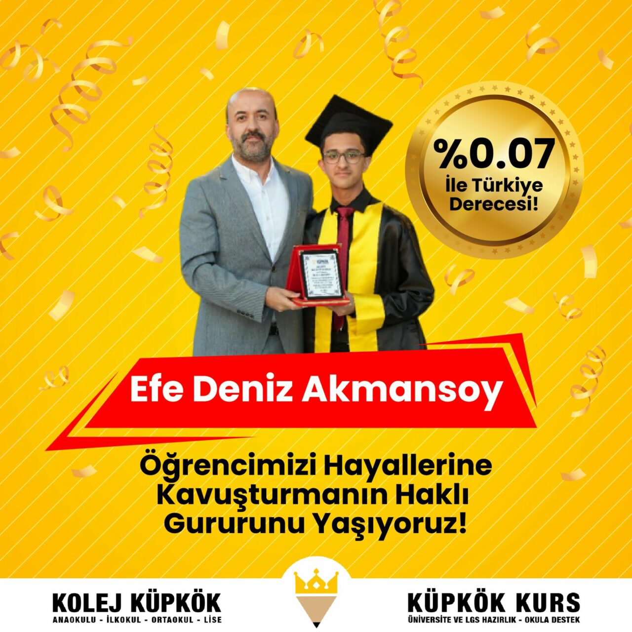 2 Haziran’da yapılan LGS merkezi sınavında 0,07’lik başarıyla Türkiye derecesi elde eden 8.sınıf öğrencisi Efe Deniz Akmansoy, Bursa Küpkök Koleji’nin gururu oldu…