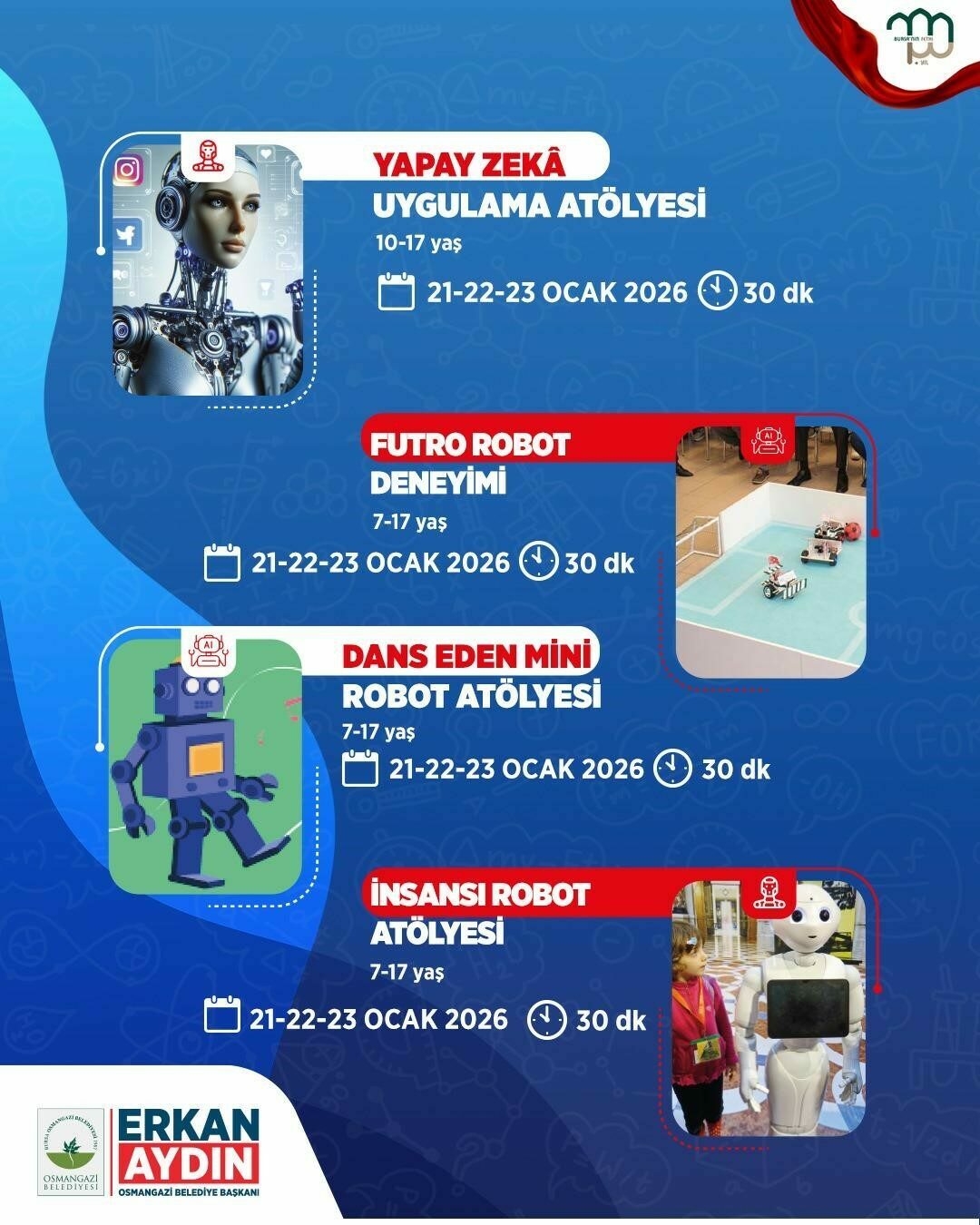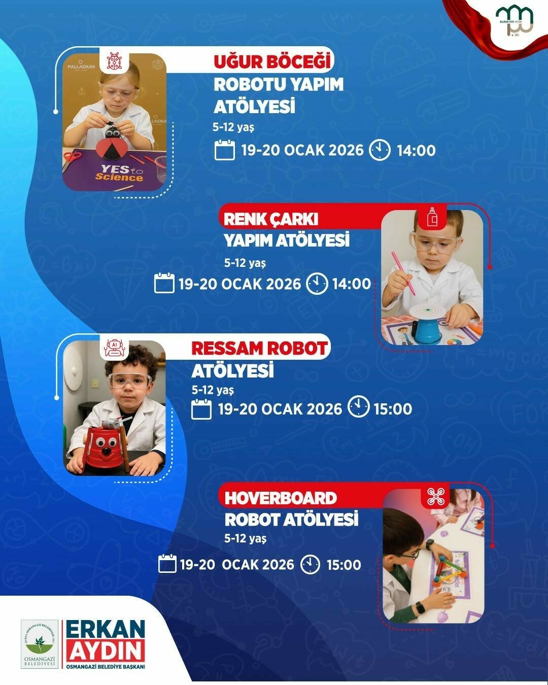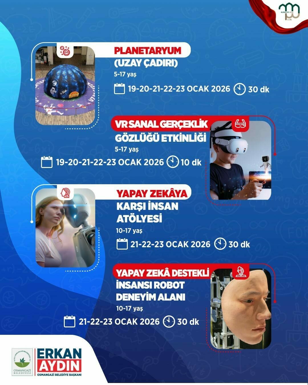 Etkinlik kapsamında robotik kodlama uygulamaları, astronomi, uzay temalı çalışmalar, kağıt sanatları, akıl ve zeka oyunları ile bilimsel içerikli birçok atölye yer alacak.