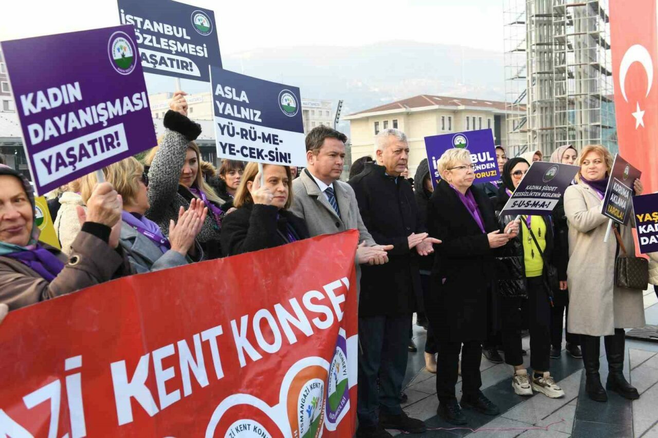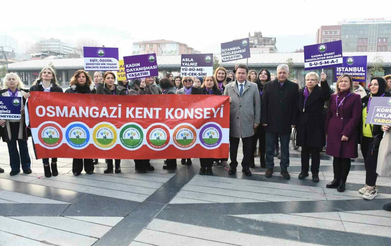 Kadına yönelik şiddetle mücadele konusunda toplumsal farkındalık oluşturmanın hedeflendiği basın açıklamasında, ‘eşit, özgür, şiddetsiz bir yaşamı birlikte kuracağız’ mesajı verildi. Osmangazi Meydanı’nda düzenlenen basın açıklamasına Osmangazi Belediye Başkanı Erkan Aydın, Osmangazi Kent Konseyi Başkanı Fatma Çil Yılmaz, Osmangazi Kent Konseyi Başkanı Sevgi Baysal, belediyedeki kadın personeller ile kadına yönelik şiddete dur diyen onlarca kadın katıldı.