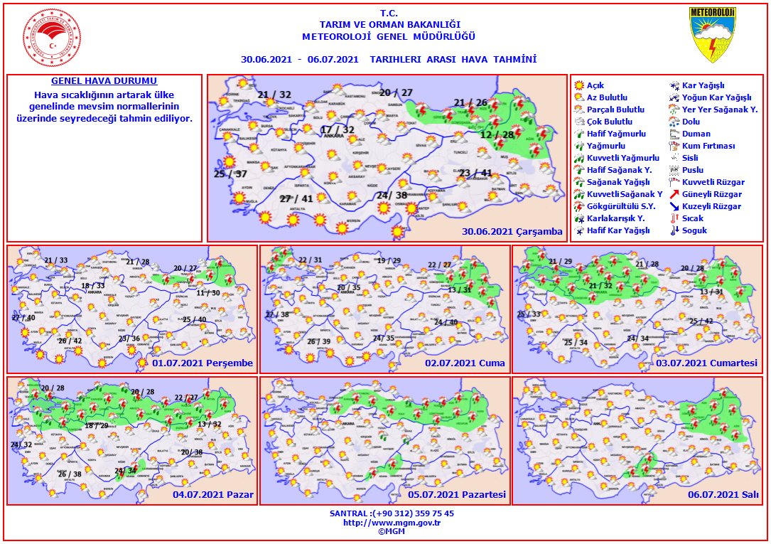 Haftalık Hava Durumu (30 Haziran – 6 Temmuz 2021) Hava sıcaklığının artarak ülke genelinde mevsim normallerinin üzerinde seyredeceği tahmin ediliyor.
