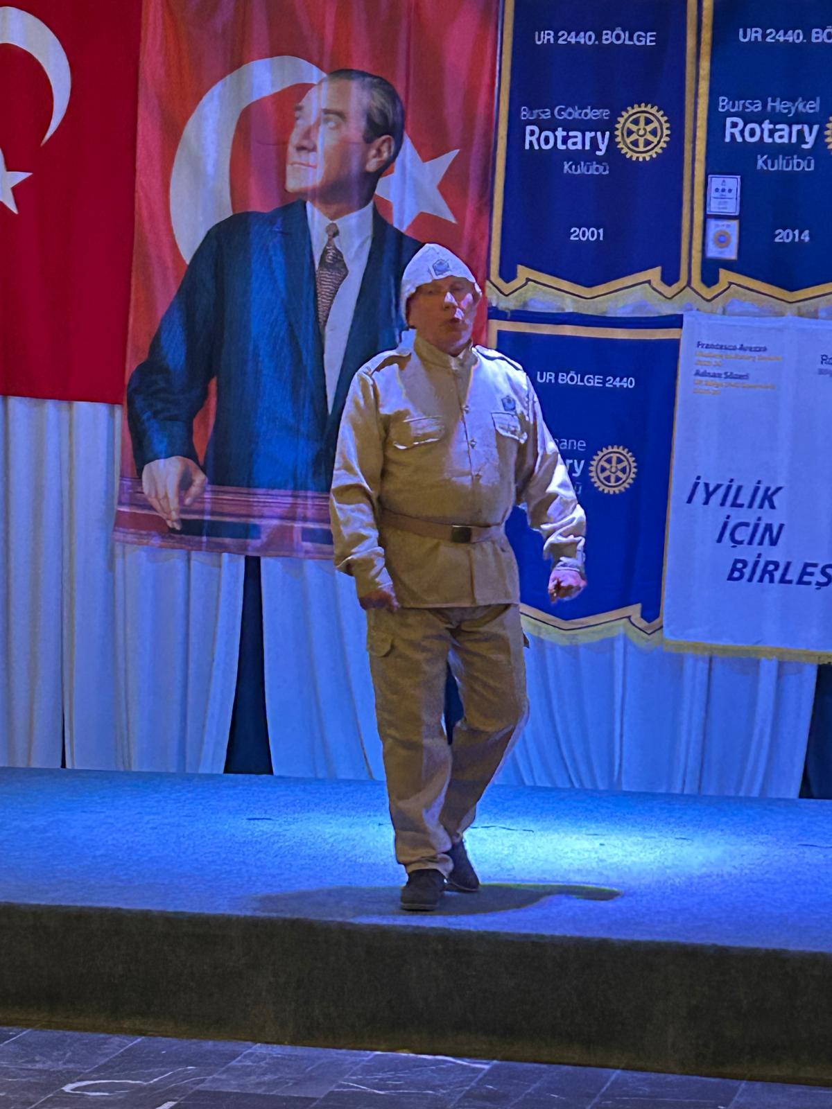 Geceye ise, Rotary Bölge 2440 Federasyonu Başkanı Adnan Sözeri’nin gerçekleştirdiği Deli Halit Paşa canlandırması damgasını vurdu. Adnan Sözeri, “Bursa’nın kurtuluşu sadece bir şehrin özgürlüğü değil, aynı zamanda milletimizin esareti reddedişinin ve bağımsızlık iradesinin en güçlü göstergesidir. Biz Rotaryenler olarak, bu toprakları bize vatan yapan kahramanlarımızı unutmamak ve unutturmamak için buradayız. 103 yıl önceki direniş ruhunu genç kuşaklarla buluşturmak en büyük sorumluluğumuzdur. Çünkü biliyoruz ki geçmişini unutan milletlerin geleceği olmaz. Biz, geçmişimizi gururla hatırlıyor, geleceğe de umutla bakıyoruz” dedi.