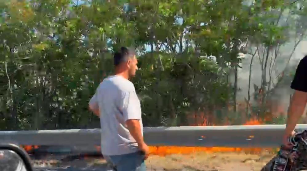Bursa Şehir Hastanesi’nin karşısında bulunan alanda çıkan yangına yoldan geçen sürücüler, araçlarından çıkardıkları yangın söndürme tüpleriyle müdahale etmeye çalışıyor.