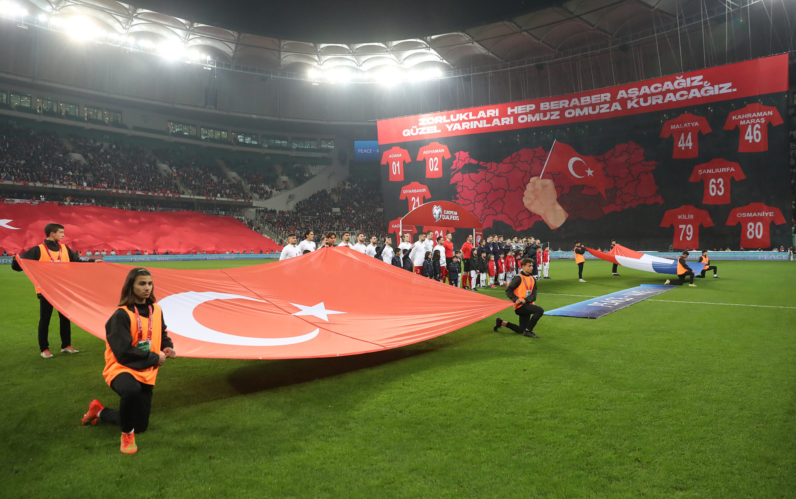 Kale arkası tribününde Türkiye haritası üzerinde “Zorlukları hep beraber aşacağız. Güzel yarınları omuz omuza kuracağız.” yazısı ile depremden etkilenen illerin plaka numaralardan yazılı olduğu mili takım formalarının yer aldığı dev görsel açıldı.