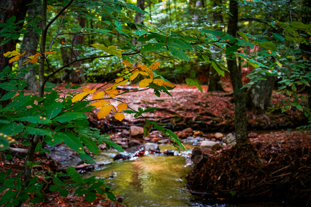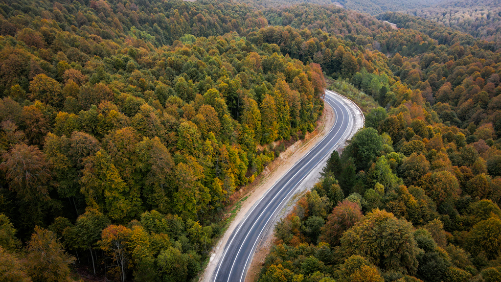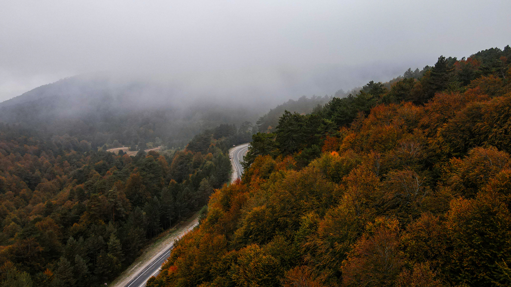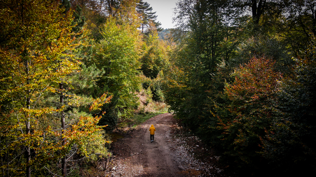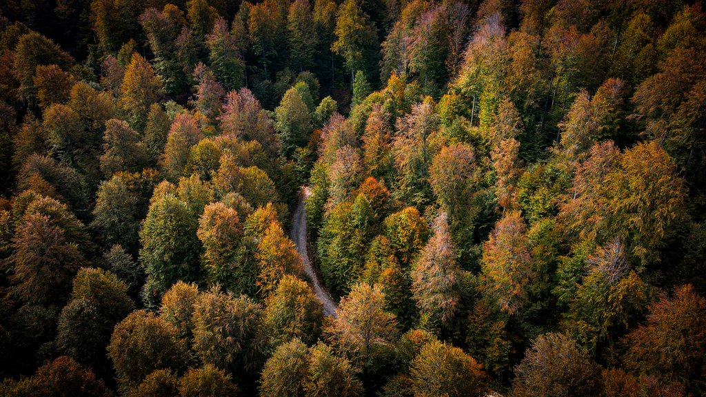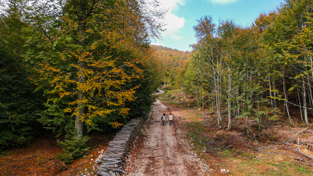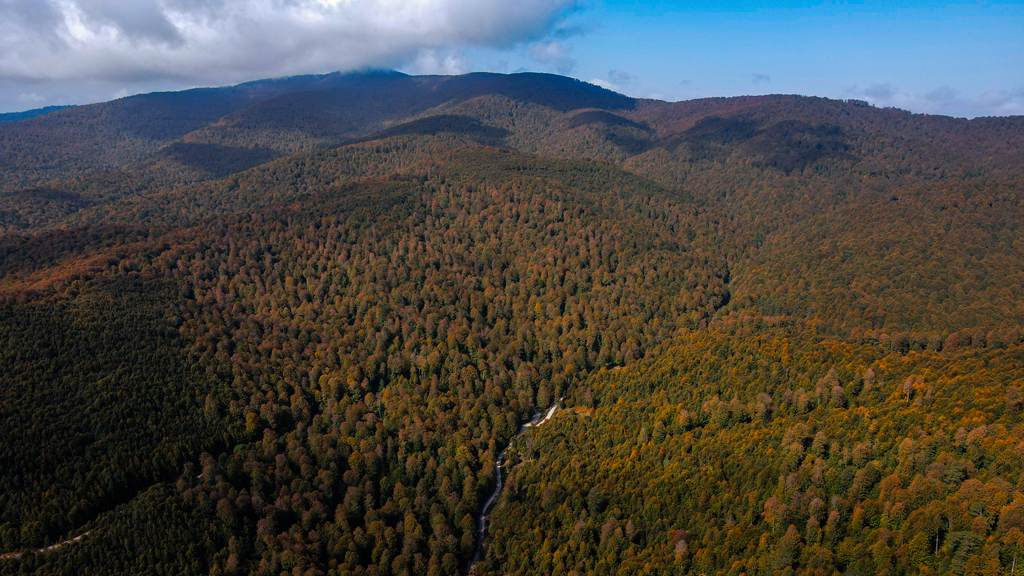 Yeşil ve sarı tonlara sahip kayın, meşe ve çam ağaçlarının oluşturduğu manzaralar dronla görüntülendi.