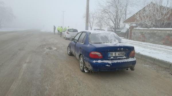 Yoğun sisin görüş mesafesini düşürdüğü yolda, Adnan Kaya’nın (34) kullandığı 10 E 4158 plakalı otomobil, ara sokaktan çıkan Mesut Şen (42) yönetimindeki 16 BJL 40 plakalı hafif ticari araca çarptı.