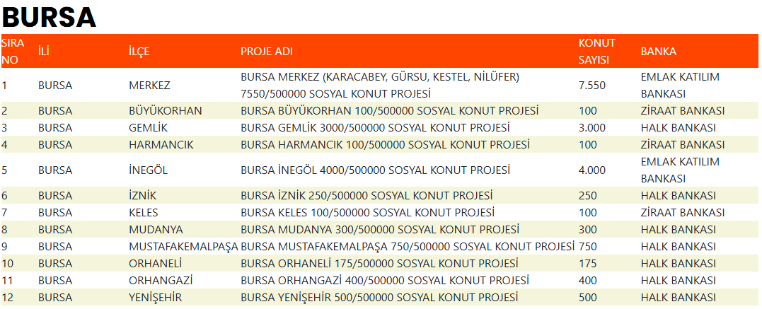 Proje kapsamında Bursa ve ilçeleri için toplam 17 bin 225 konut kontenjanı ayrıldı.