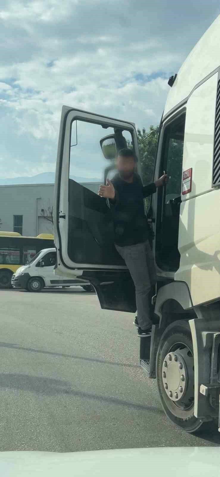 Trafiği durduran tır sürücüsünün aracına binerken el kol hareketleri yapması da kayıtlara yansıdı.