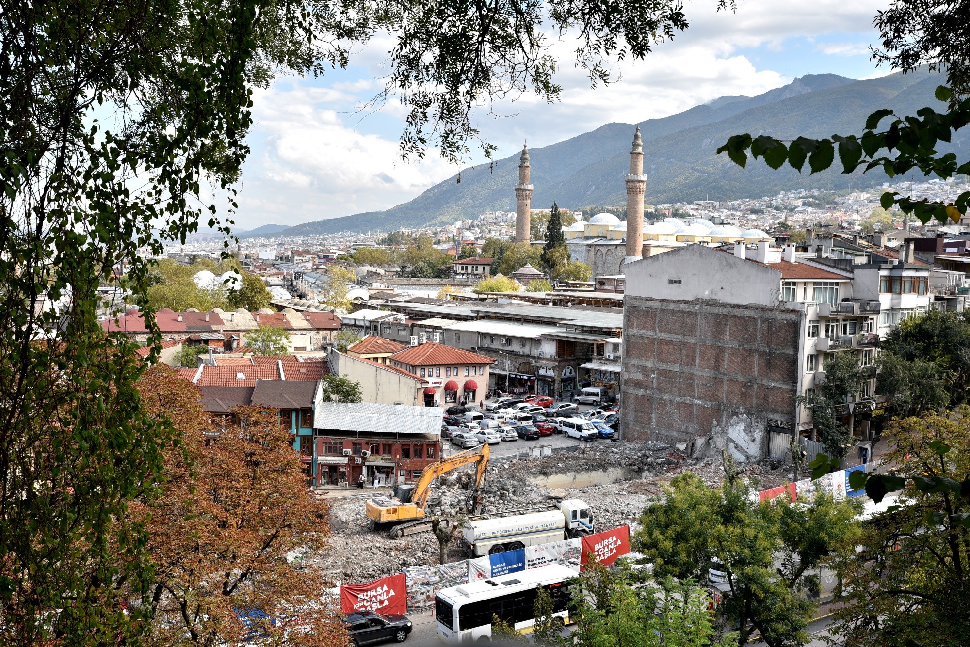 Osmanlı’nın ilk başkenti olan Bursa’da 14. yüzyılda oluşmaya başlayan, 16. yüzyılda han, bedesten ve çarşıların oluşumuyla gelişimini tamamlayan Tarihi Çarşı ve Hanlar Bölgesi’ni etrafını çevreleyen binalardan arındırarak yeniden gün yüzüne çıkaracak proje hız kesmeden devam ediyor. Bursa Büyükşehir Belediyesi’nin, Çevre ve Şehircilik Bakanlığı tarafından da desteklenen projesinde, çalışmalar kapsamında Kızılay, İşkur ve Merkez Bankası binalarının yıkımı tamamlanırken, hafriyat kaldırma çalışmaları da tüm hızıyla devam ediyor. Henüz 2 ayı bile bulmayan zamanda yapılan çalışmalar, daha şimdiden kente büyük bir değer kattı. Osmanlı’nın 4’üncü sultanı Yıldırım Beyazıt tarafından Niğbolu Zaferi’nin adağı olarak yaptırılan, İslam âleminin en yüksek mertebedeki 5’inci büyük mabedi kabul edilen 600 yıllık Ulu Cami, artık Cemal Nadir Caddesi üzerinden de görünmeye başladı. Öte yandan Ulu Cami ile Tophane ve Hisar Bölgesi arasında adeta perde görevi gören binaların kalkmasıyla iki tarihi bölge arasındaki görsel bağlantı da sağlanmış oldu.