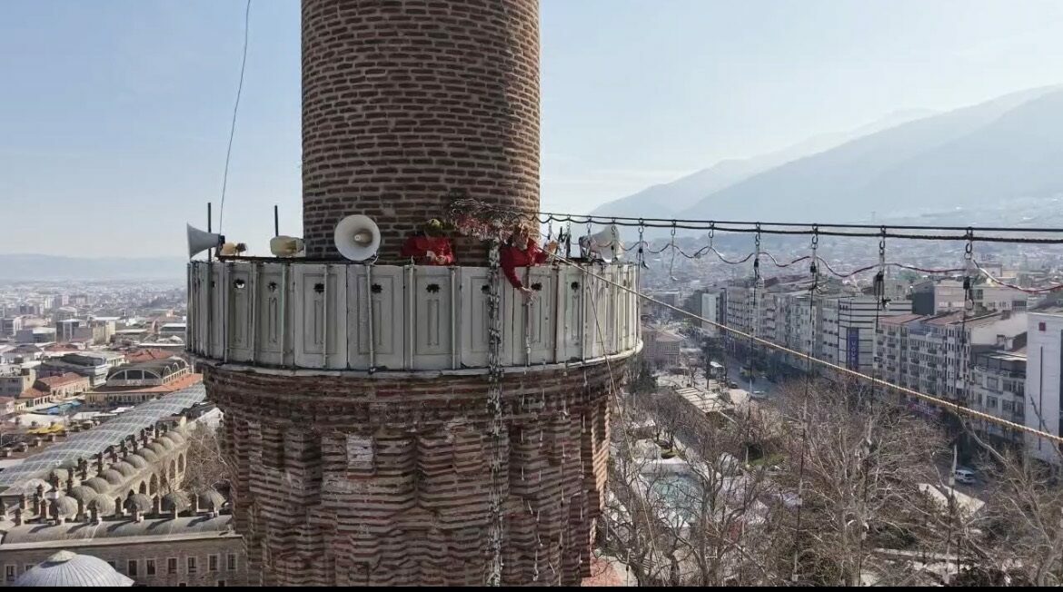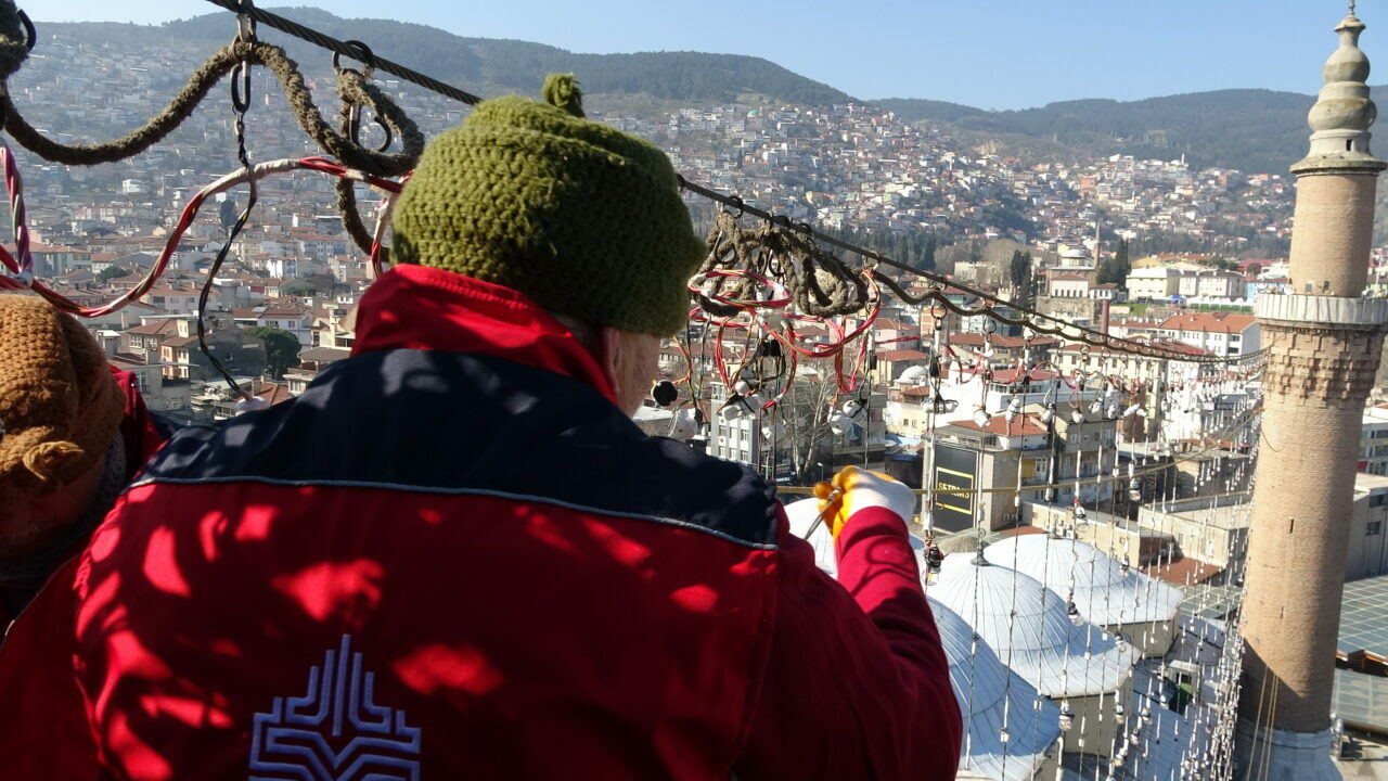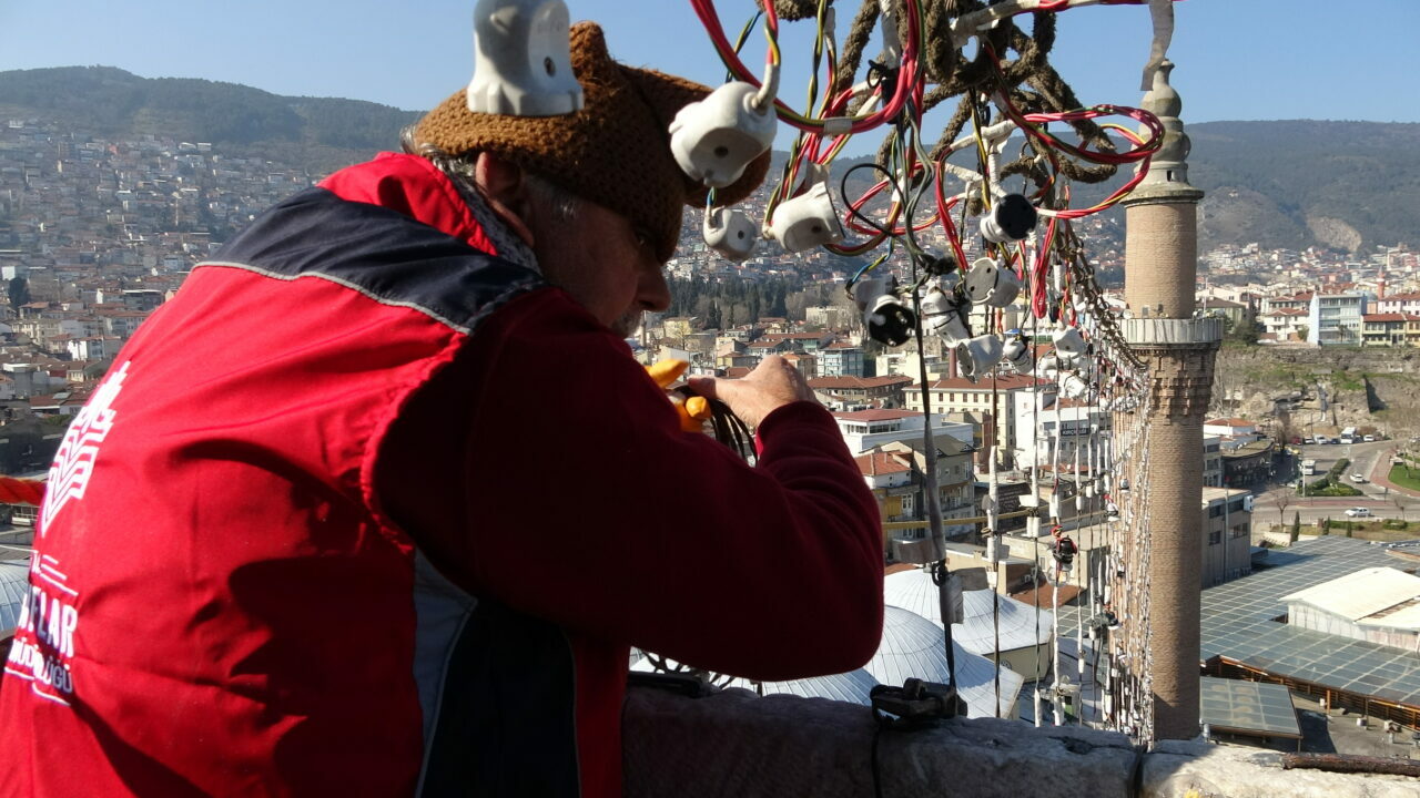 Bursa’da, selatin camileri arasındaki tarihi Ulucami’ye, Kültür ve Turizm Bakanlığı Bursa Vakıflar Bölge Müdürlüğü koordinesinde, mahyacı Kahraman Yıldız ile ekibi tarafından hazırlanan ikinci mahya yerleştirildi.