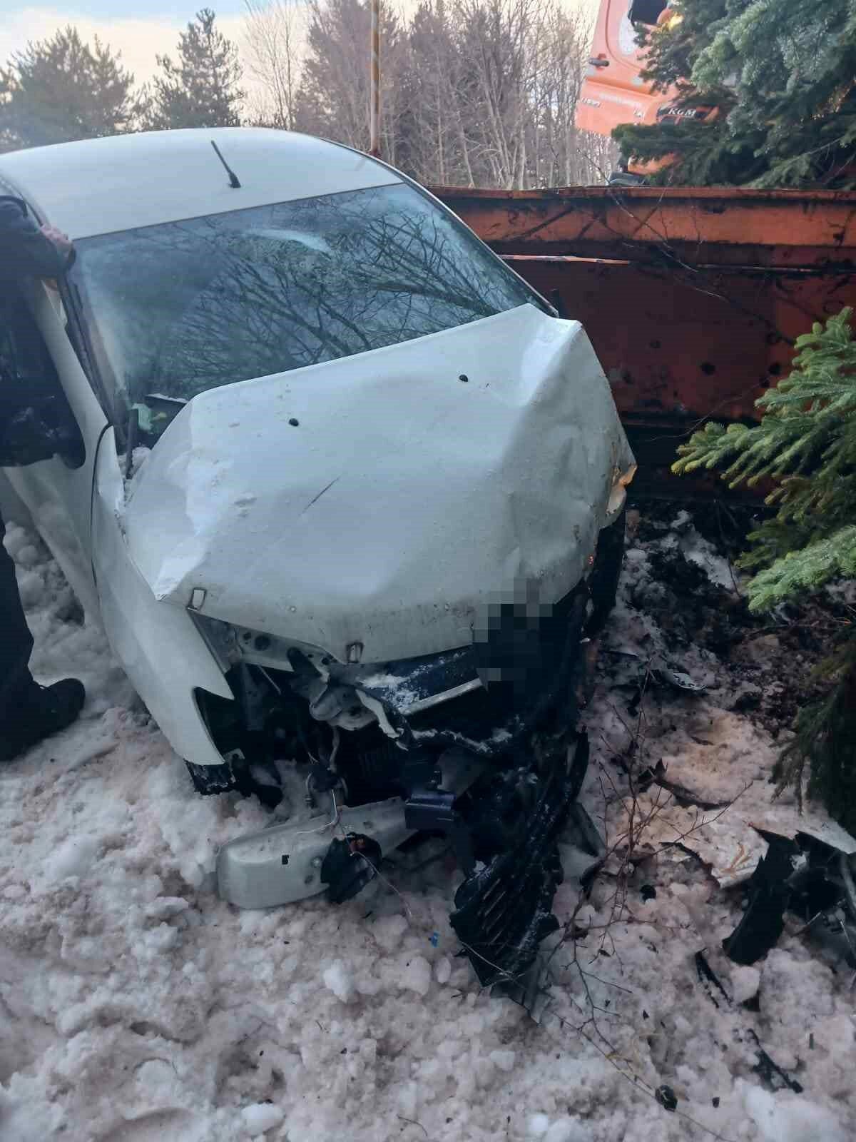 Kar temizleme çalışması yapan kar küreme aracı, sürücüsünün direksiyon hakimiyetini kaybetmesi sonucu seyir halindeki otomobille çarpıştı.
