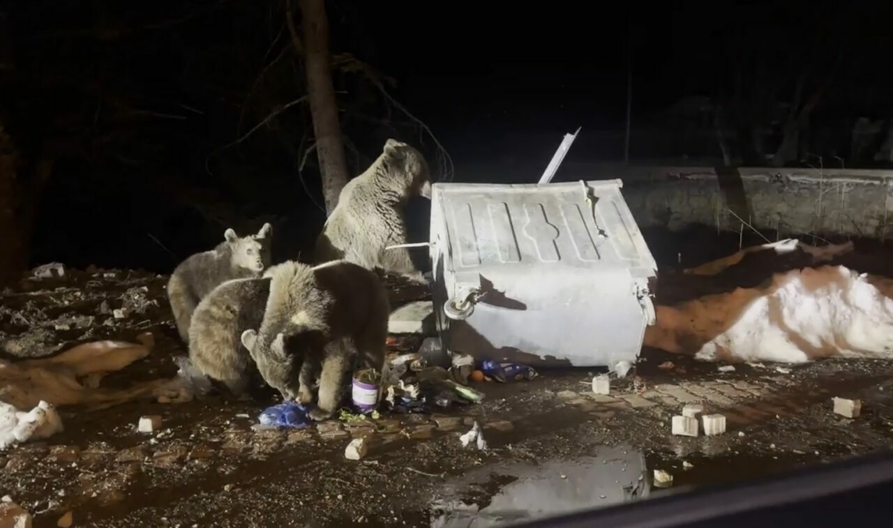 Ormandan çıkan 3’ü yavru 4 ayı, Sarıalan bölgesine gelerek yol kenarındaki çöp konteynerlerinde yiyecek aradı.