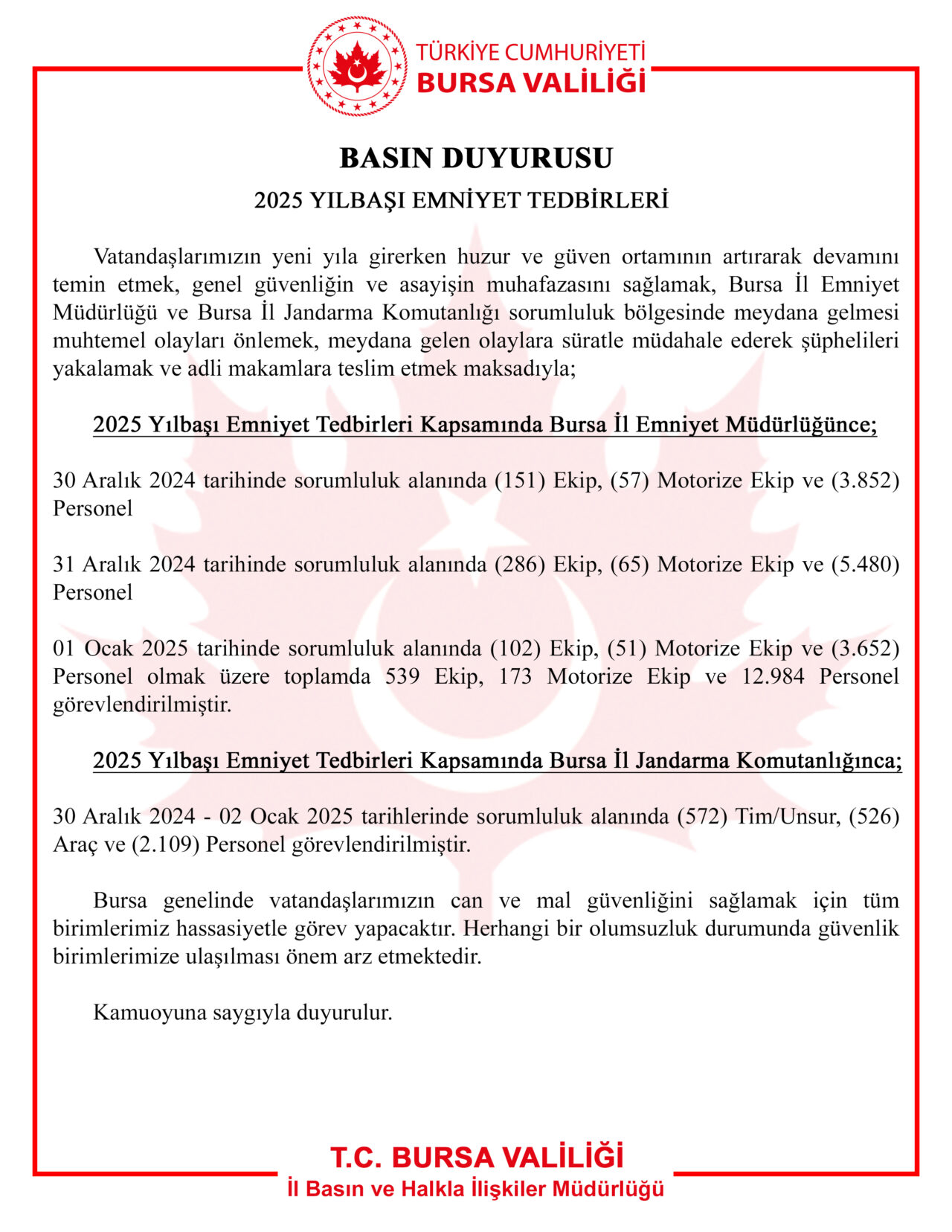 “Vatandaşlarımızın yeni yıla girerken huzur ve güven ortamının artırarak devamını temin etmek, genel güvenliğin ve asayişin muhafazasını sağlamak, Bursa İl Emniyet Müdürlüğü ve Bursa İl Jandarma Komutanlığı sorumluluk bölgesinde meydana gelmesi muhtemel olayları önlemek, meydana gelen olaylara süratle müdahale ederek şüphelileri yakalamak ve adli makamlara teslim etmek maksadıyla;