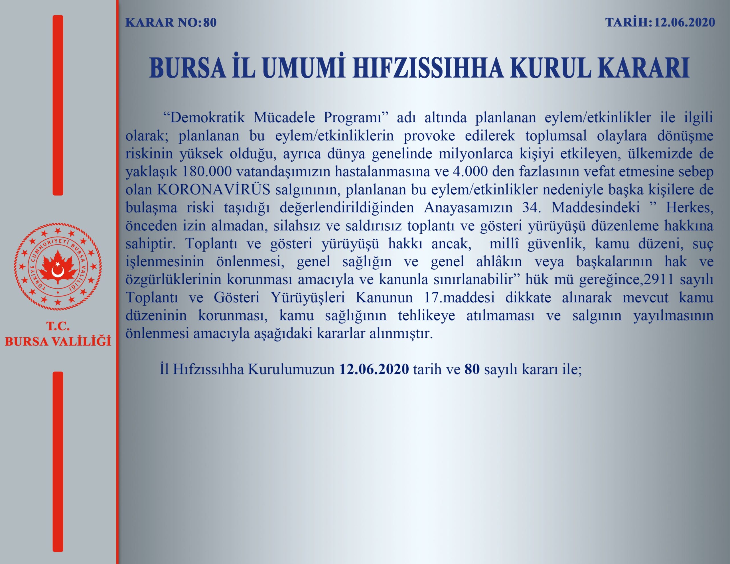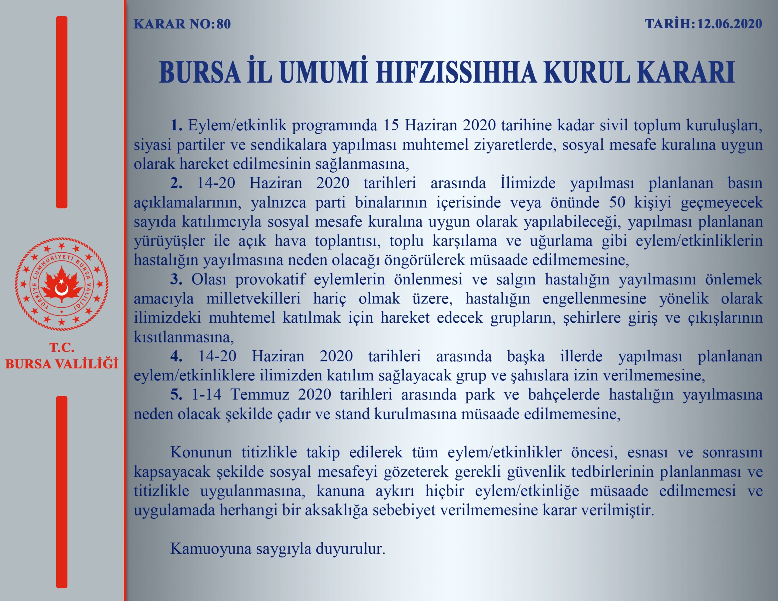 Ana Sayfa › Bursa › Merkez › Bursa Valiliği duyurdu! Giriş çıkışlara kısıtlama…Bursa Valiliği duyurdu! Giriş çıkışlara kısıtlama… Bursa’daki yeni tip koronavirüs (Kovid-19) tedbirleri kapsamında, eylem ve etkinliğe katılım amacıyla araç ve kişilerin kente giriş çıkışları yasaklandı. Giriş: 14-06-2020 17:35Güncelleme: 14-06-2020 18:38Kaynak: MerkezBursa ABONE OL + - HABERİ PAYLAŞ