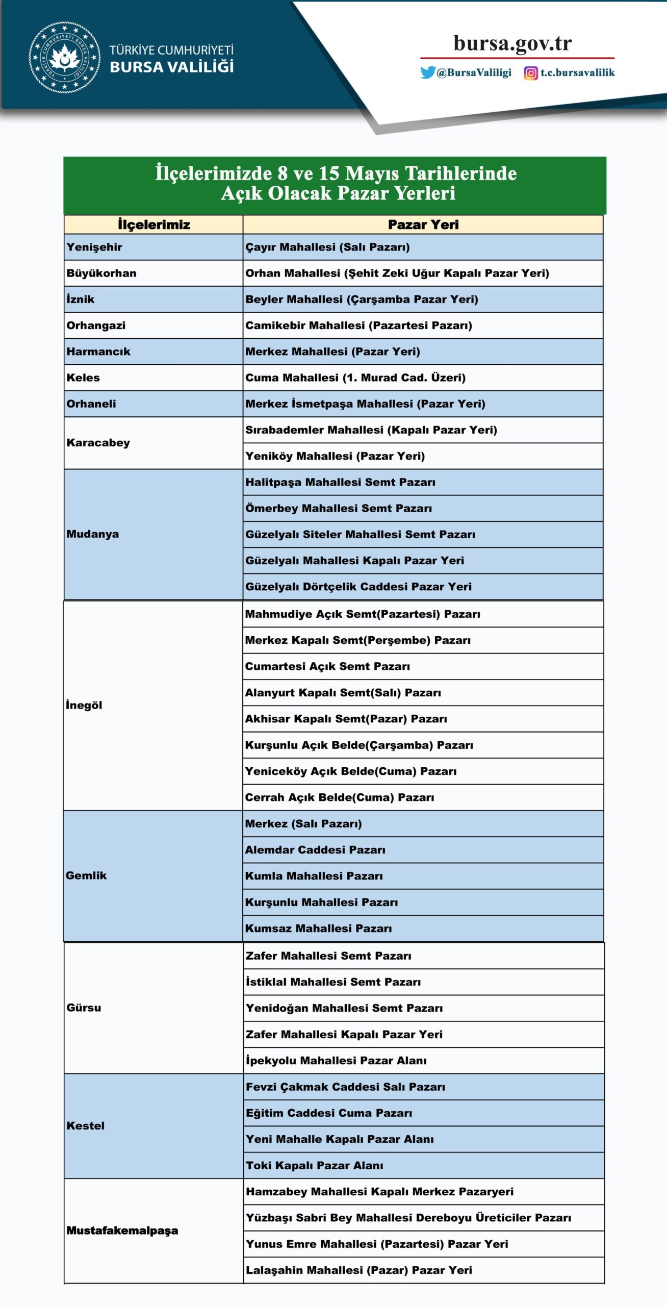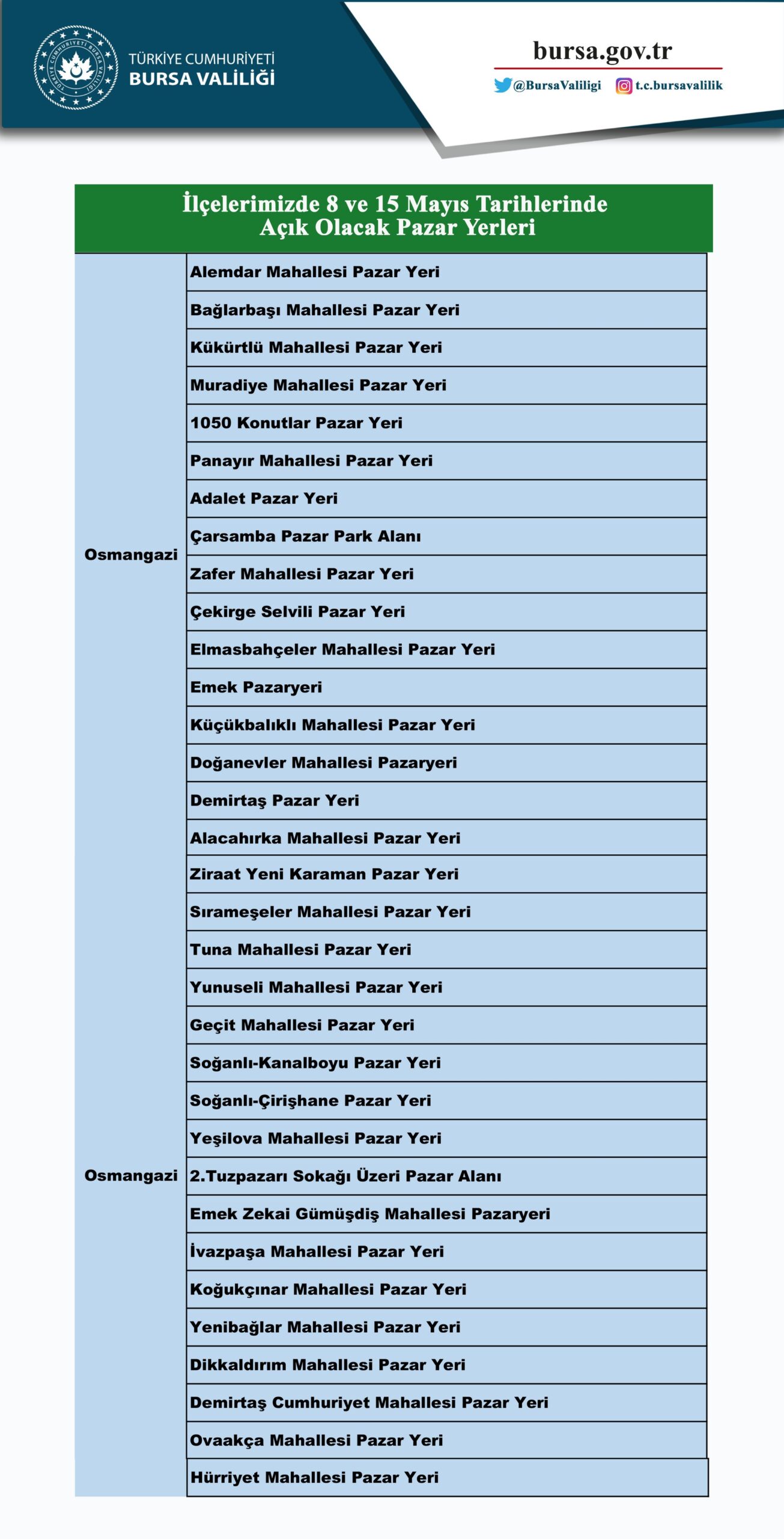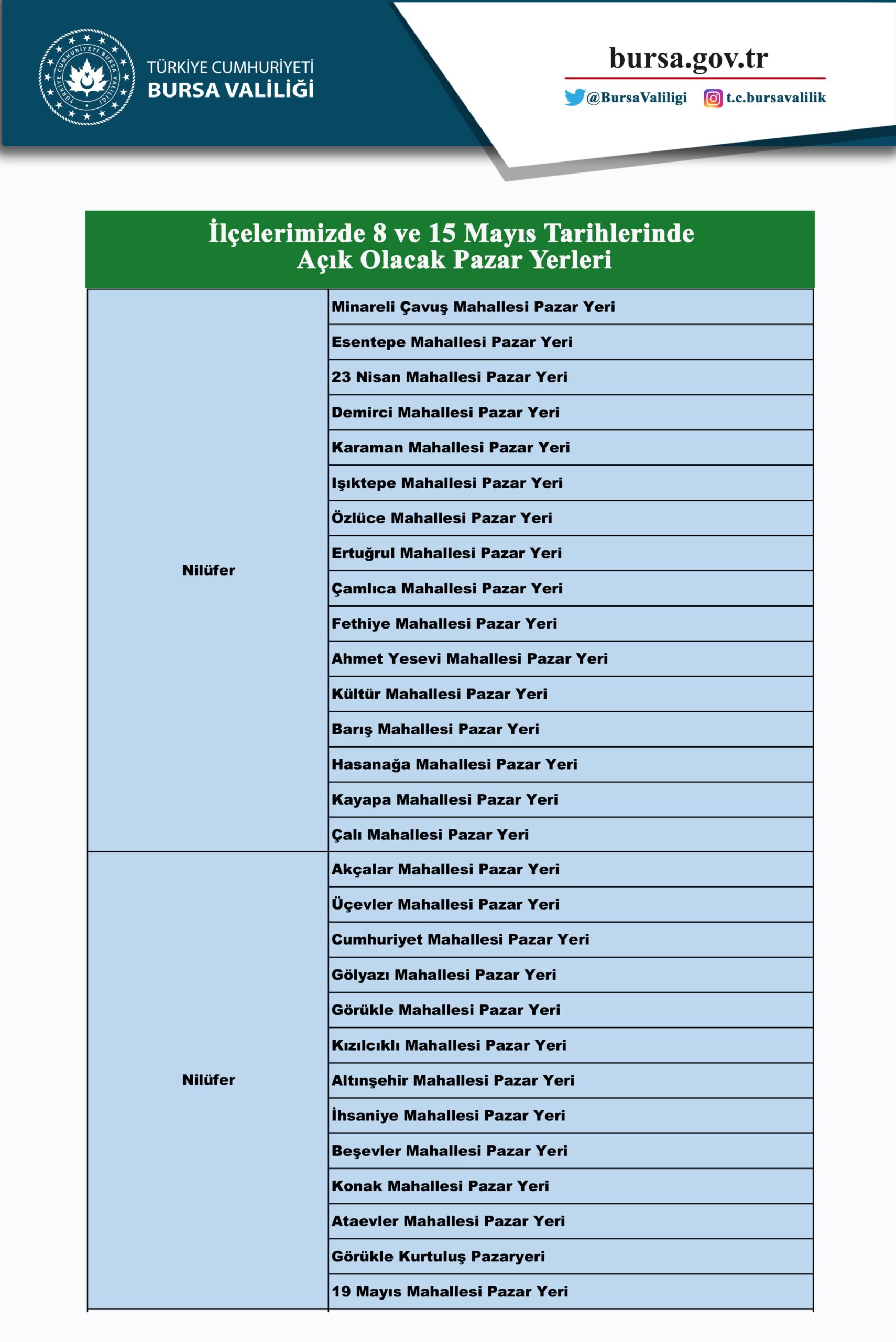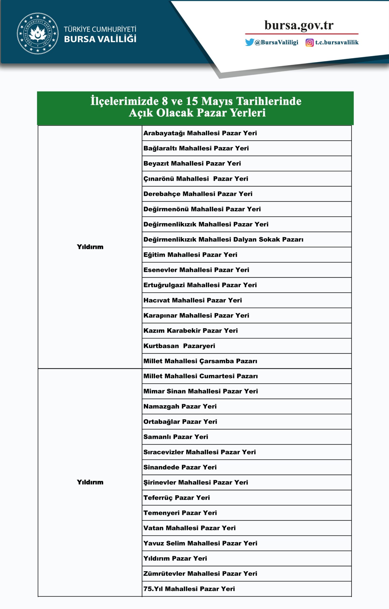 Bursa Valiliği tarafından yayınlanan semt pazarları listesi şöyle;