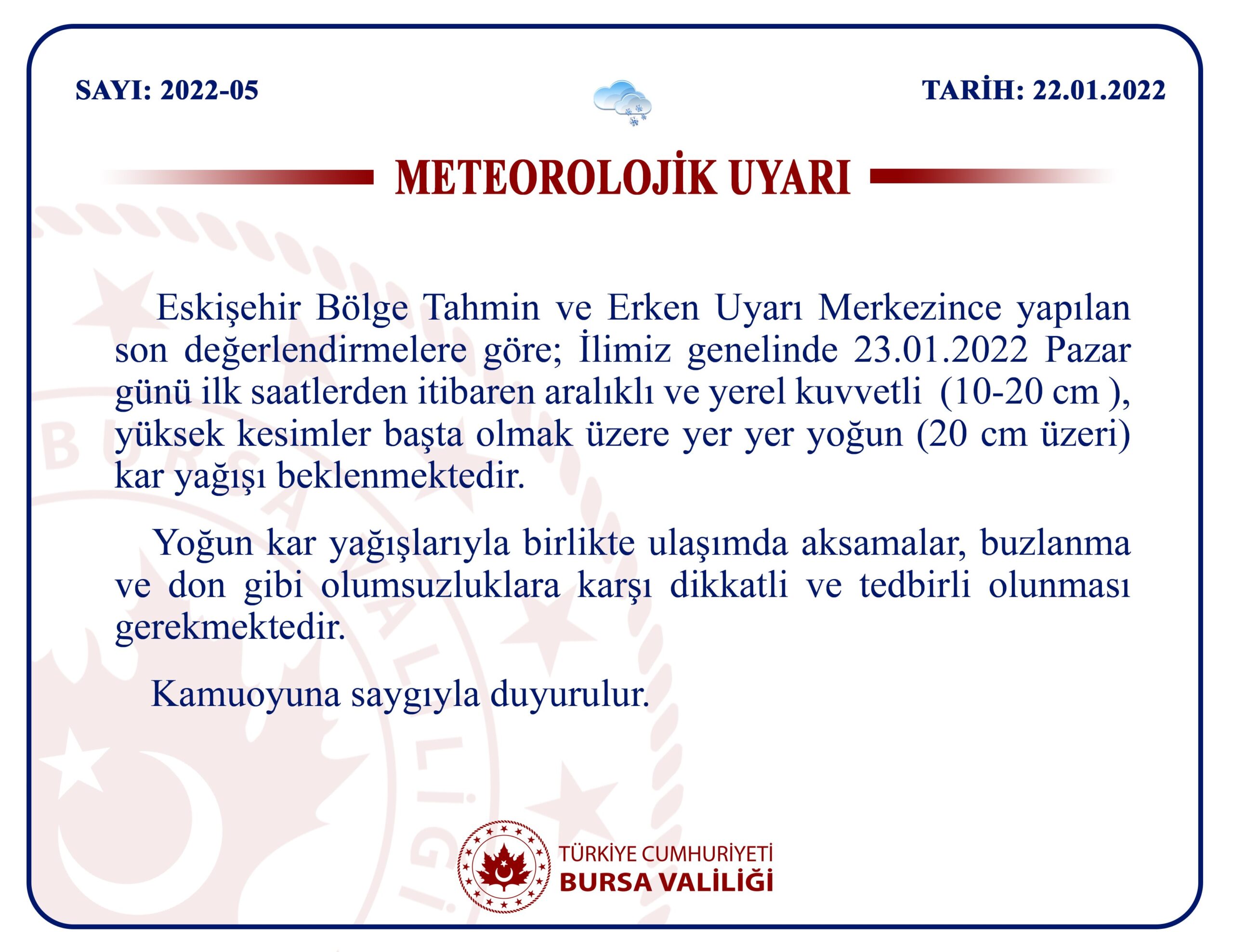 “Eskişehir Bölge Tahmin ve Erken Uyarı Merkezince yapılan son değerlendirmelere göre; İlimiz genelinde 23.01.2022 Pazar günü ilk saatlerden itibaren aralıklı ve yerel kuvvetli (10-20 cm ), yüksek kesimler başta olmak üzere yer yer yoğun (20 cm üzeri) kar yağışı beklenmektedir.