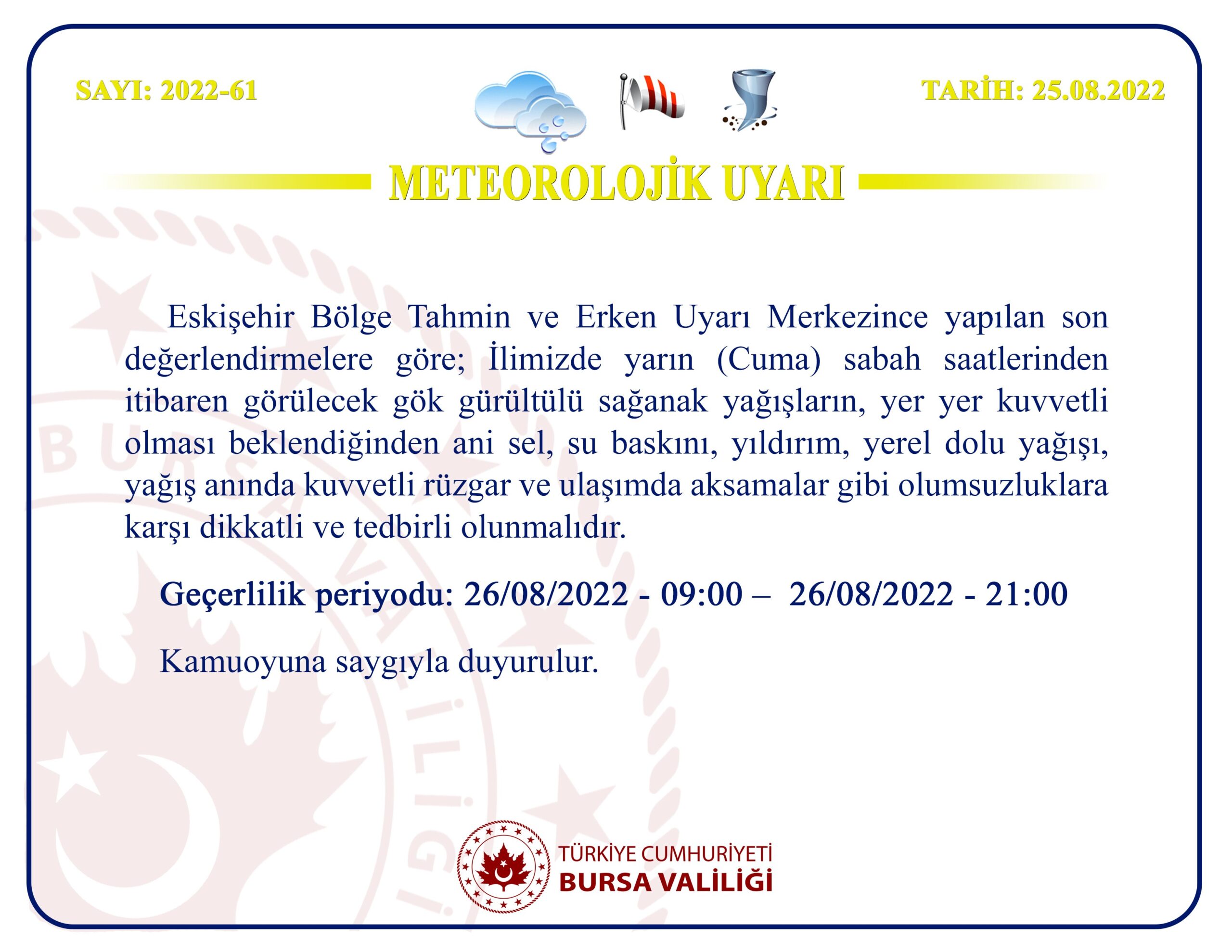 Bursa Valiliği, yarın Bursa’da görülmesi muhtemel yağışlarla ilgili uyarı mesajı yayınladı…