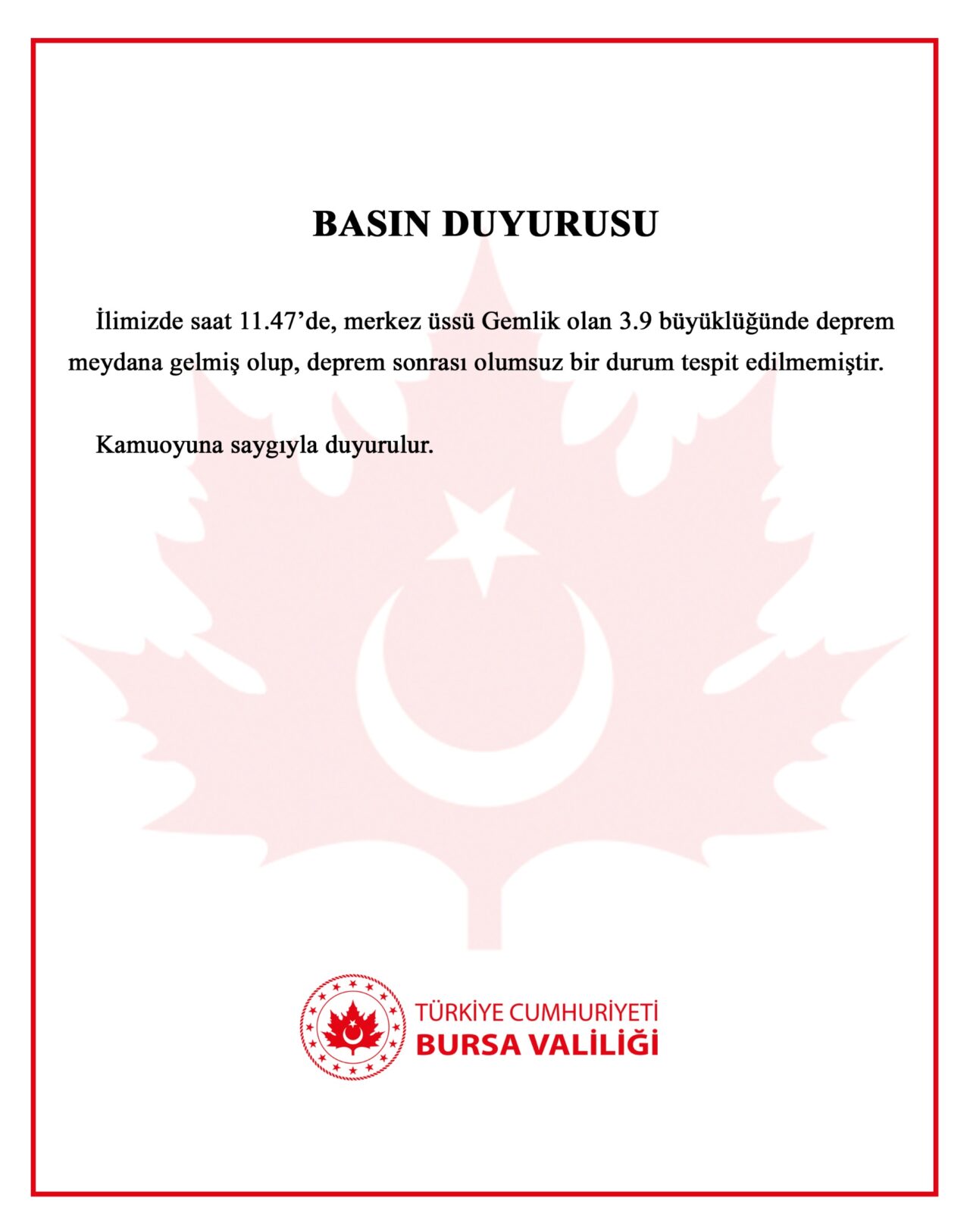 “İlimizde saat 11.47’de, merkez üssü Gemlik olan 3.9 büyüklüğünde deprem meydana gelmiş olup, deprem sonrası olumsuz bir durum tespit edilmemiştir.