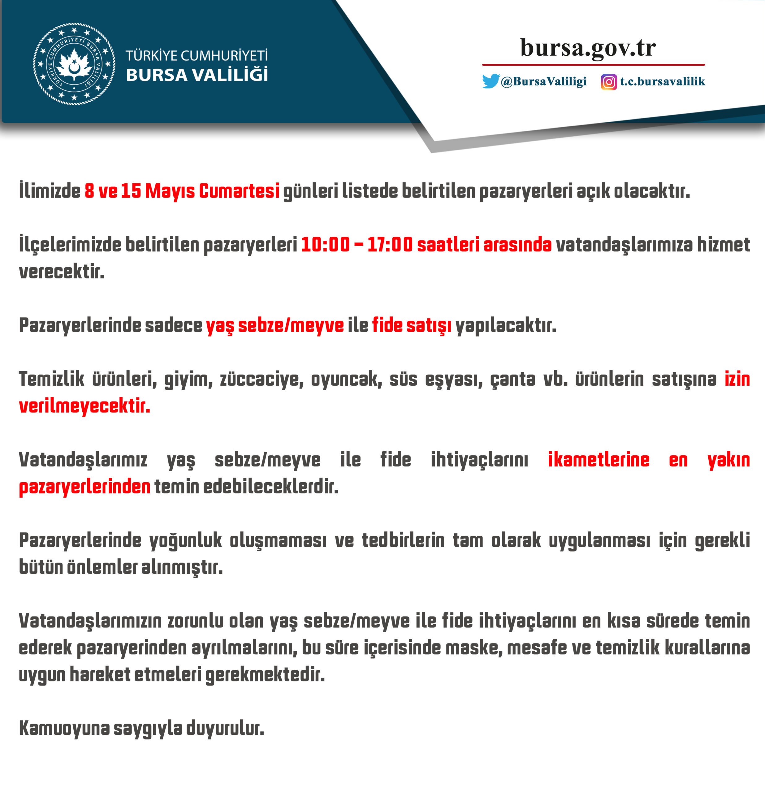 Bursa Valiliği, yarın ve 15 Mayıs Cumartesi günü kurulacak semt pazarlarıyla ilgili kararları duyurdu…
