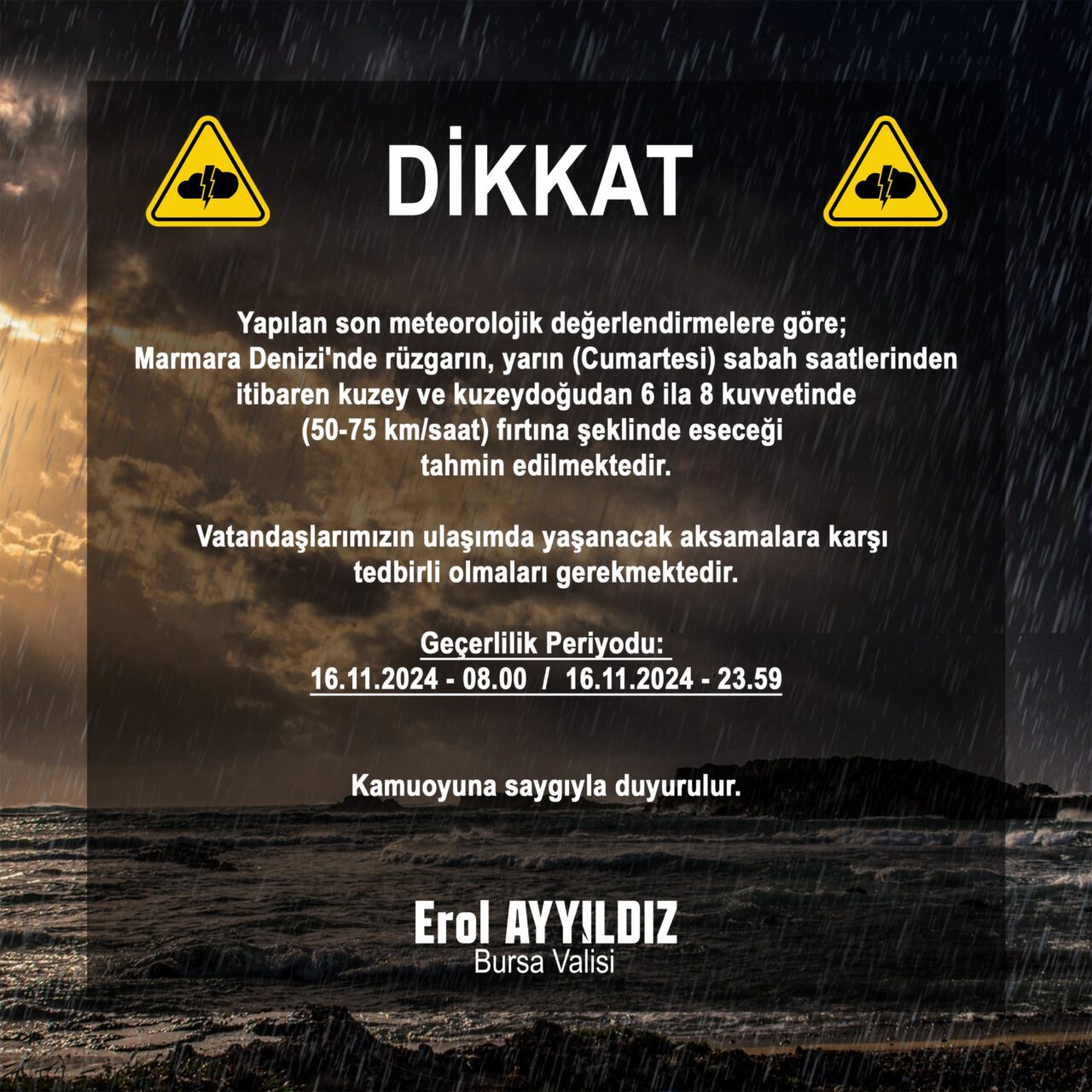 Marmara Denizi’nde rüzgarın, yarın (Cumartesi) sabah saatlerinden itibaren kuzey ve kuzeydoğudan 6 ila 8 kuvvetinde (50-75 km/saat) fırtına şeklinde eseceği tahmin edilmektedir.