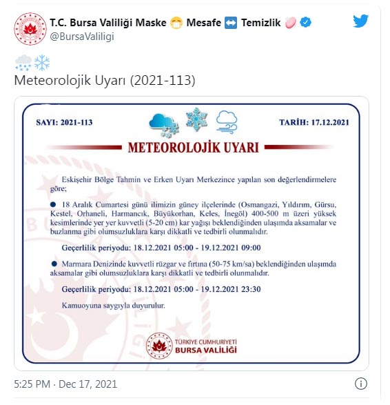 18 Aralık Cumartesi günü ilimizin güney ilçelerinde (Osmangazi, Yıldırım, Gürsu, Kestel, Orhaneli, Harmancık, Büyükorhan, Keles, İnegöl) 400-500 m üzeri yüksek kesimlerinde yer yer kuvvetli (5-20 cm) kar yağışı beklendiğinden ulaşımda aksamalar ve buzlanma gibi olumsuzluklara karşı dikkatli ve tedbirli olunmalıdır. Geçerlilik periyodu: 18.12.2021 05:00 – 19.12.2021 09:00