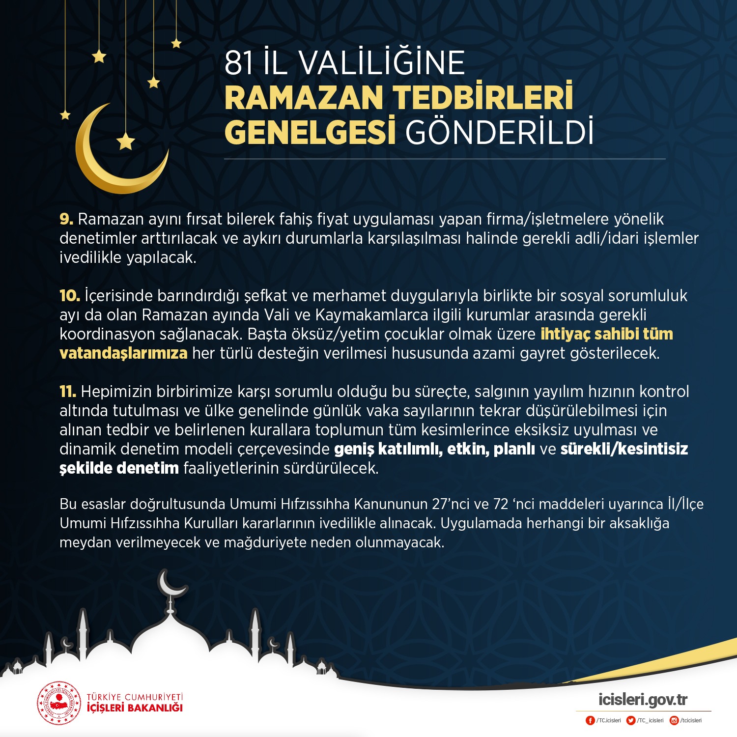 “81 İl Valiliği’ne Ramazan Tedbirleri Genelgesi gönderildi” başlığıyla verilen paylaşımda Ramazan’da uygulanacak tedbirler sıralandı…