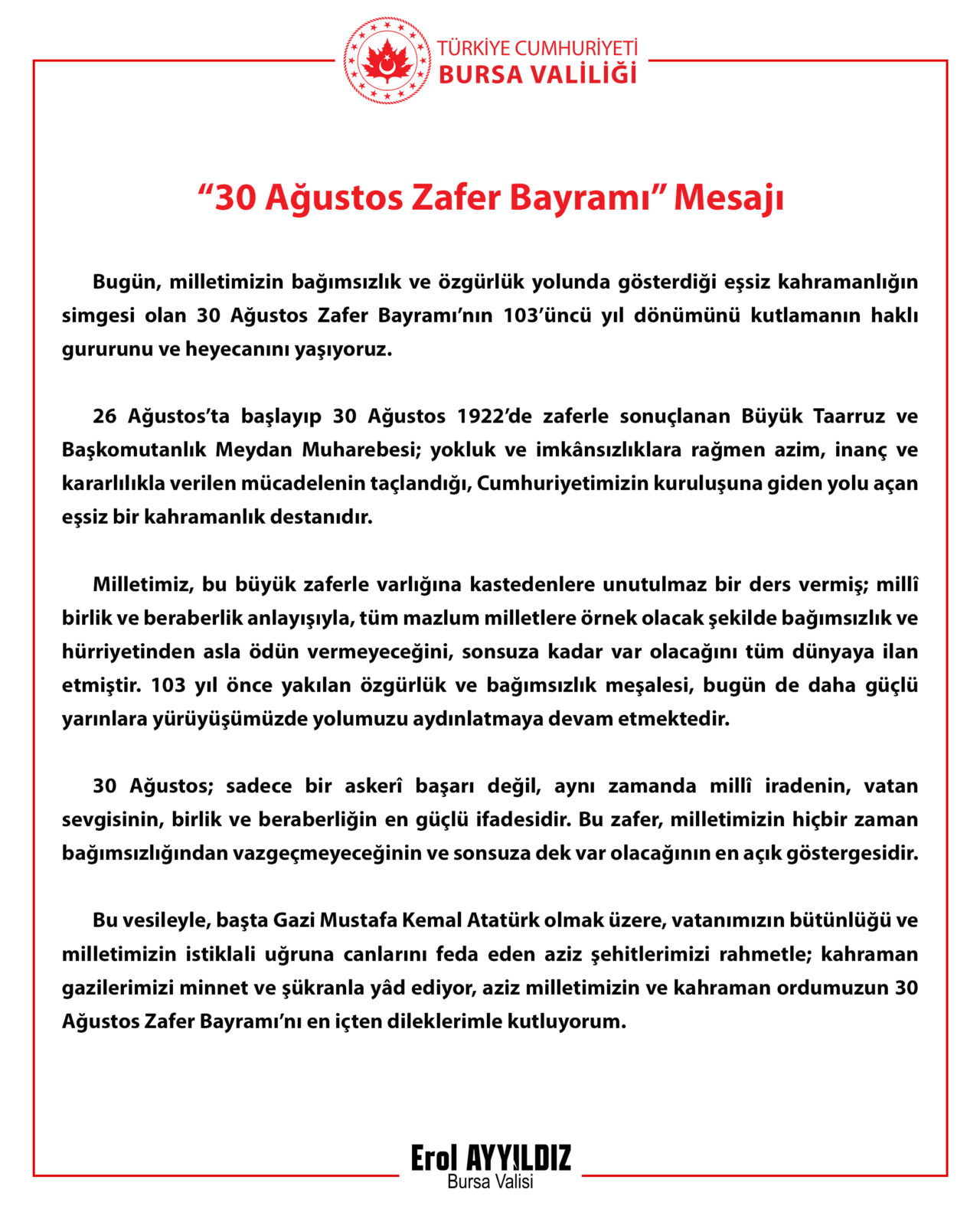 Bursa Valisi Erol Ayyıldız, 30 Ağustos Zafer Bayramı dolayısıyla mesaj yayınladı.