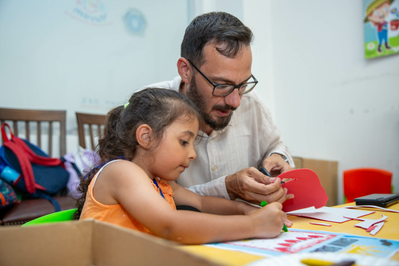 Babalarıyla birlikte çerçeve tasarlayarak resim çizen çocuklar, kendi yaptıkları çalışmaları babalarına hediye etti.
