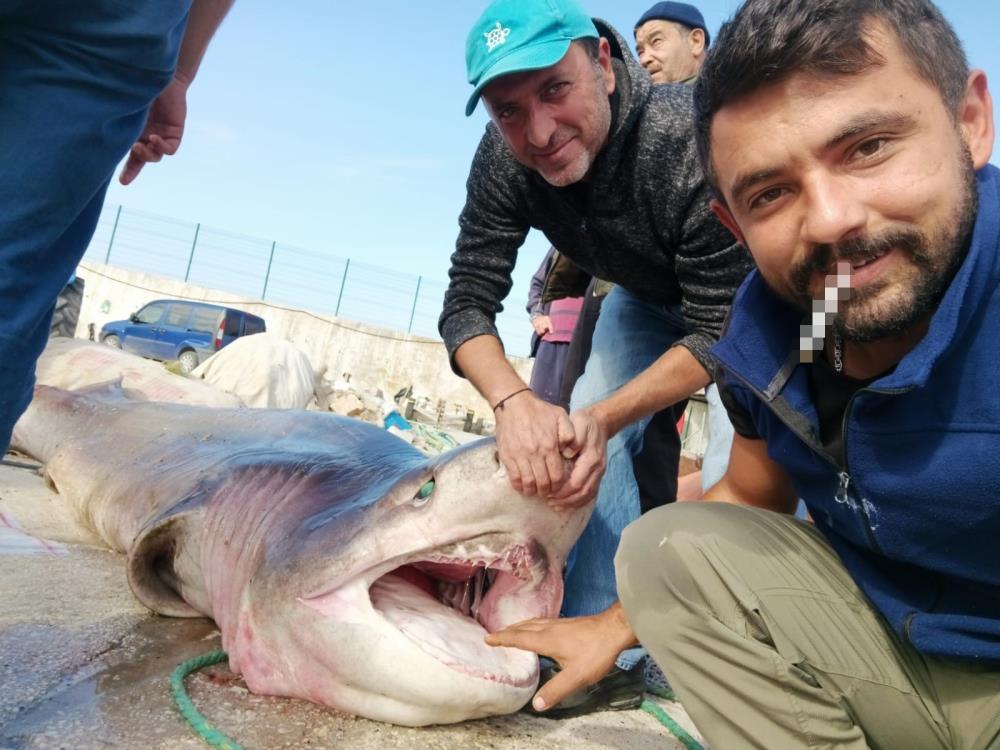 Diğer balıklarla birlikte gemiye çekilen köpekbalığı Kurşunlu’daki balıkçı barınağına getirildi.