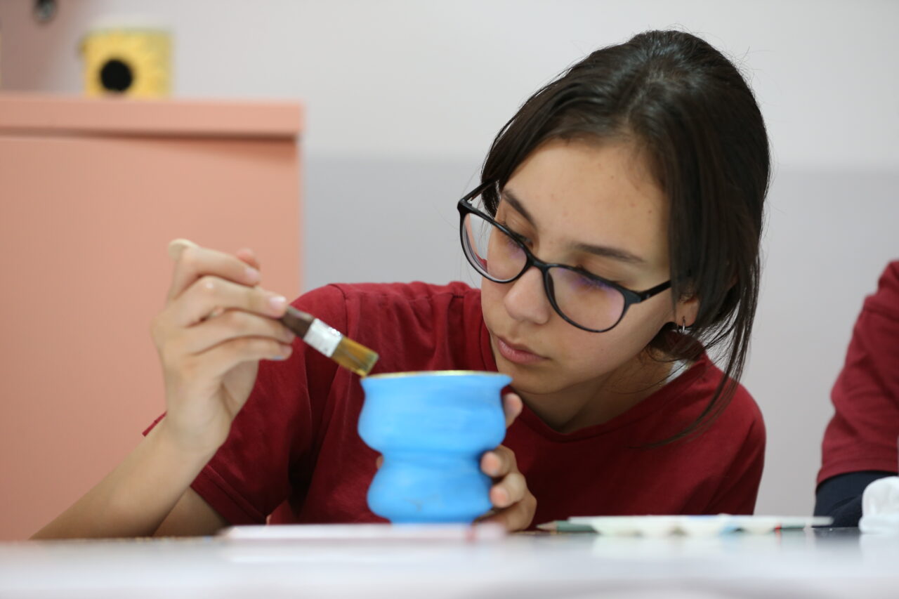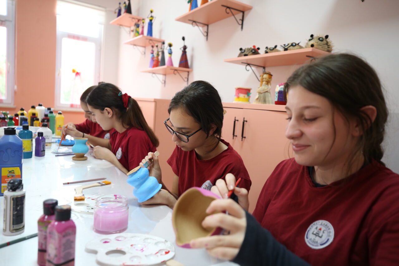 Öğrenciler, resim öğretmenleri ve usta öğreticiler eşliğinde çömlekten takı kutusu, mumluk, şekerlik, vazo gibi dekoratif ürünler ve mutfak eşyaları üretiyor.