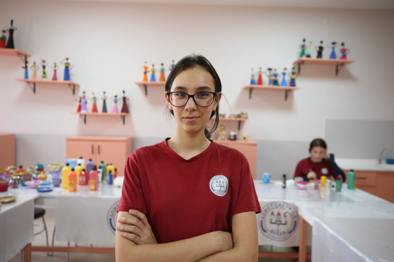 Ahmet Çabuk Ortaokulu 8. sınıf öğrencisi Hatice Rana Yalçın, çömlek atölyesinde vazo, kalemlik, takı kutusu, kase gibi dekoratif ürünler yaptıklarını söyledi.