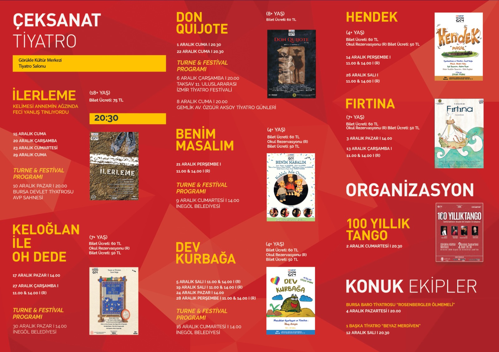 6 Aralık Çarşamba 20.00’de TAKSAV 11. Uluslararası İzmir Tiyatro Festivali’nde, 8 Aralık Cuma 20.00’de Gemlik Av. Özgür Aksoy Tiyatro Günleri’nde ‘’Don Quıjote’’ oyunu sahne alıyor. Aralık ayında İnegöllü çocuklar ile buluşacak olan Tiyatro; 9 Aralık Cumartesi günü ‘’Benim Masalım’’, 16 Aralık Cumartesi günü “Dev Kubağa” ve 30 Aralık Cumartesi günü ise ‘’Keloğlan İle Oh Dede’’ oyunları ile sahnede olacak.